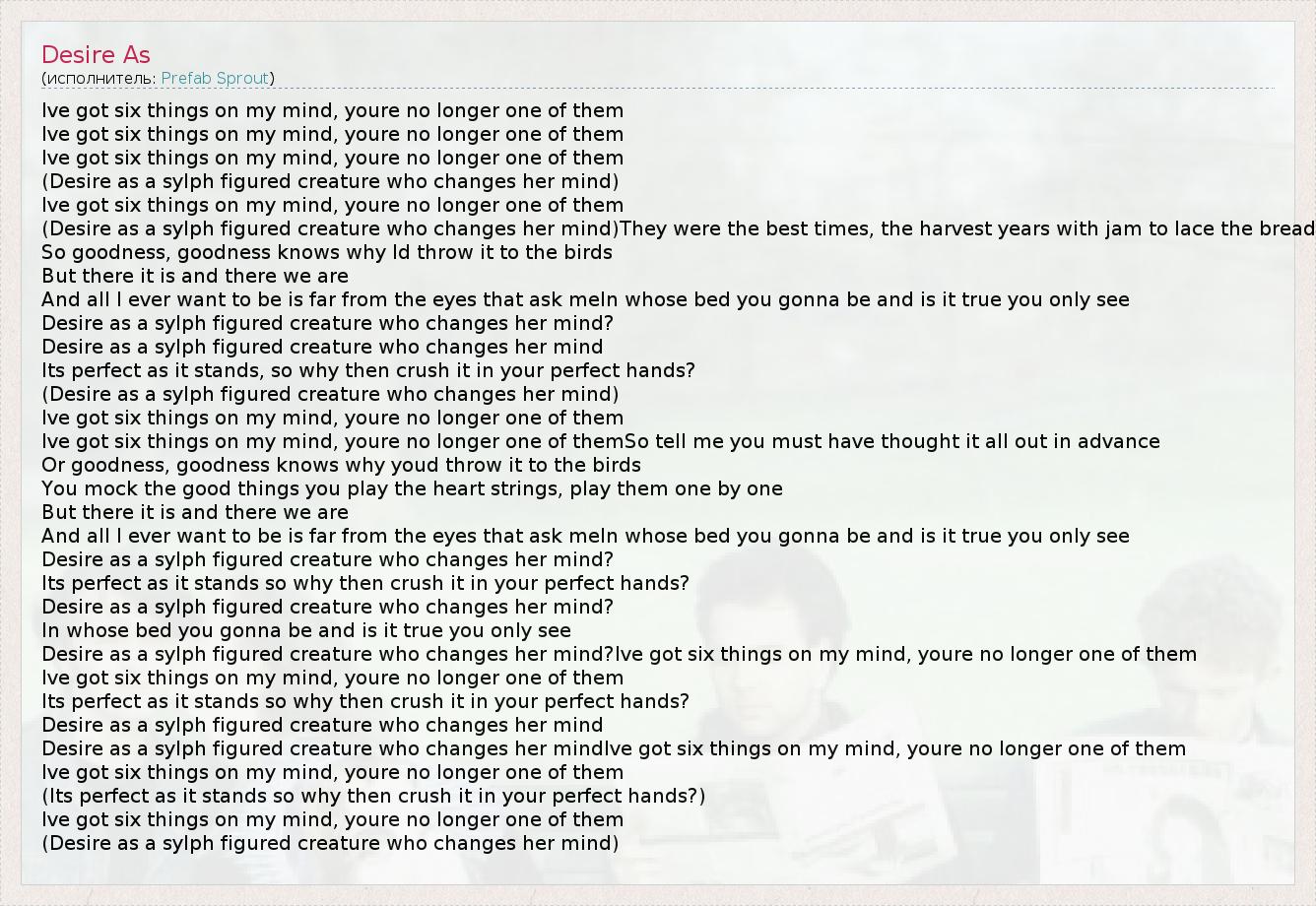 Desire as a sylph figured creature who changes her mind?Ive got six things on my mind, youre no longer one of them
