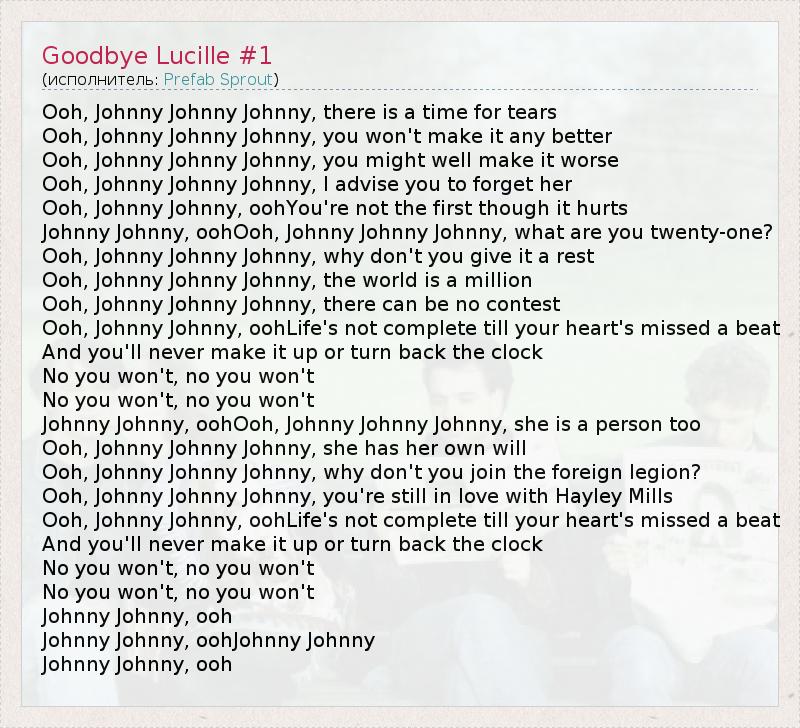 Ooh, Johnny Johnny Johnny, there is a time for tears Ooh, Johnny Johnny Johnny, you won't make it any better Ooh, Johnny Johnny Johnny, you might well make it worse Ooh, Johnny Johnny Johnny, I advise you to forget her Ooh, Johnny Johnny, oohYou're not the first though it hurts Johnny Johnny, oohOoh, Johnny Johnny Johnny, what are you twenty-one? Ooh, Johnny Johnny Johnny, why don't you give it a rest Ooh, Johnny Johnny Johnny, the world is a million Ooh, Johnny Johnny Johnny, there can be no contest Ooh, Johnny Johnny, oohLife's not complete till your heart's missed a beat And you'll never make it up or turn back the clock No you won't, no you won't No you won't, no you won't Johnny Johnny, oohOoh, Johnny Johnny Johnny, she is a person too Ooh, Johnny Johnny Johnny, she has her own will Ooh, Johnny Johnny Johnny, why don't you join the foreign legion? Ooh, Johnny Johnny Johnny, you're still in love with Hayley Mills Ooh, Johnny Johnny, oohLife's not complete till your heart's missed a beat And you'll never make it up or turn back the clock No you won't, no you won't No you won't, no you won't Johnny Johnny, ooh Johnny Johnny, oohJohnny Johnny Johnny Johnny, ooh