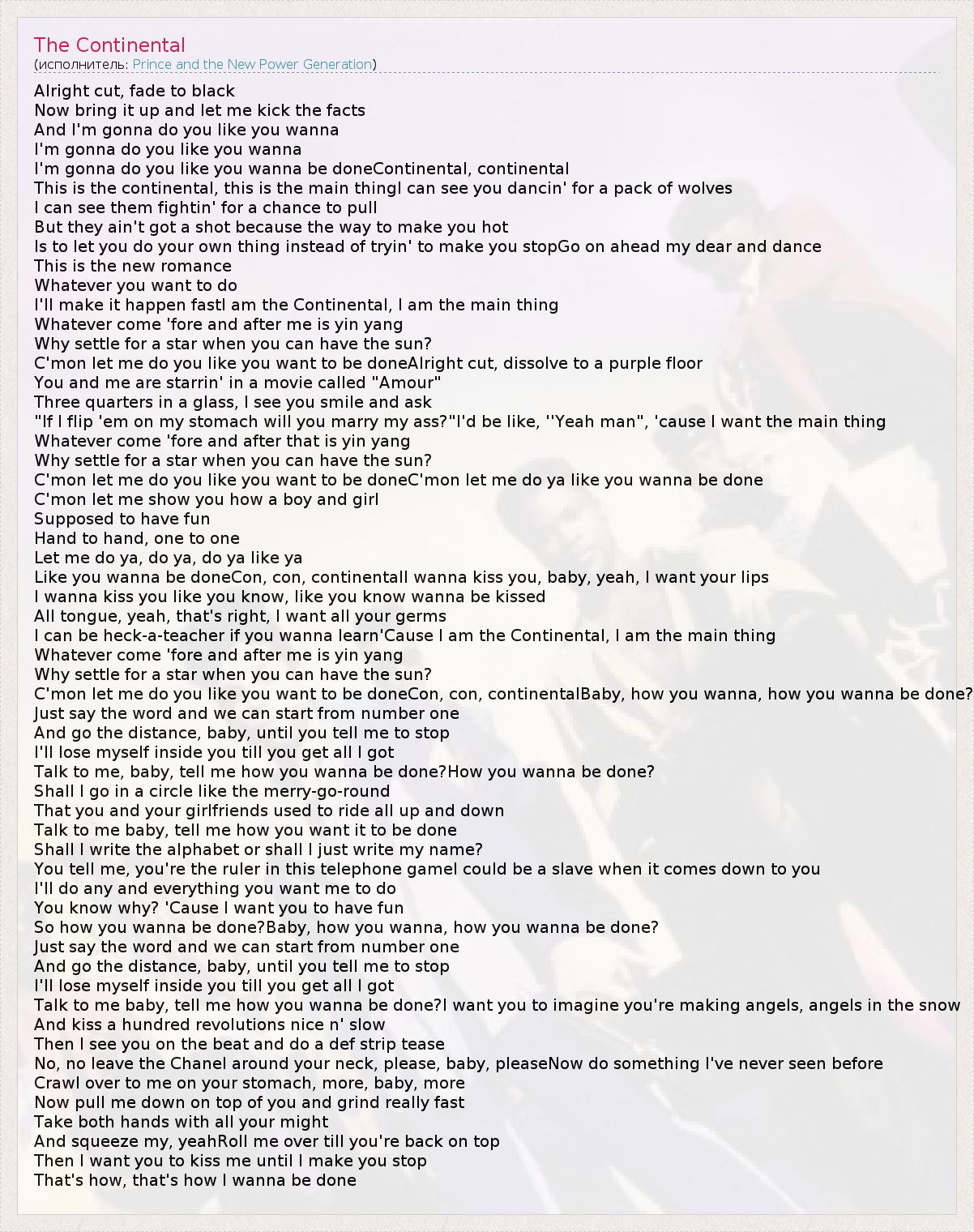 Like you wanna be doneCon, con, continentalI wanna kiss you, baby, yeah, I want your lips