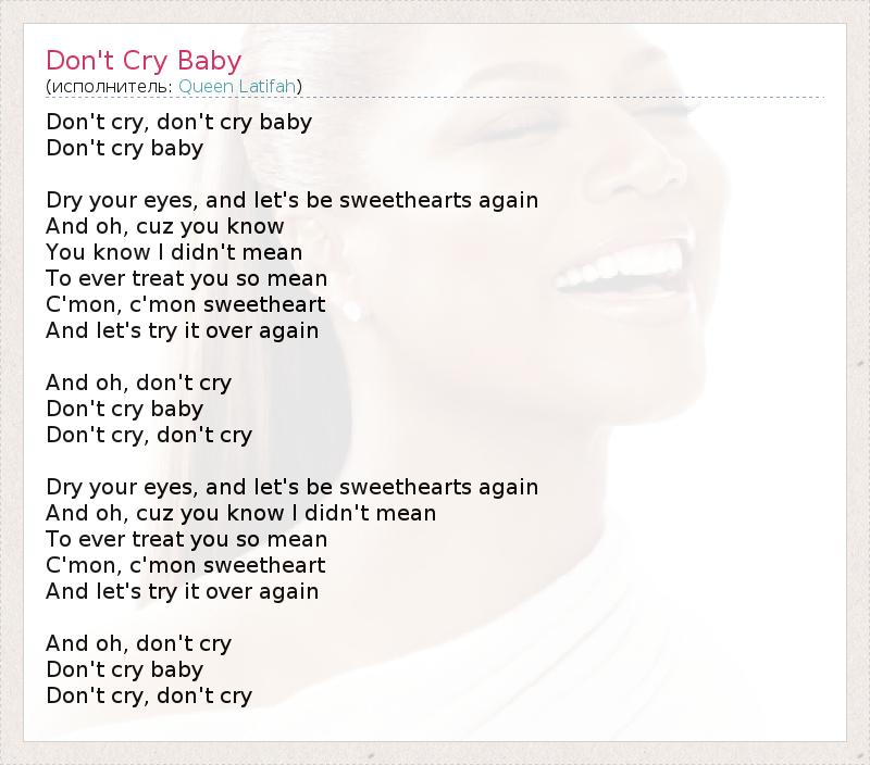 Don't cry, don't cry baby Don't cry baby Dry your eyes, and let's be sweethearts again And oh, cuz you know You know I didn't mean To ever treat you so mean C'mon, c'mon sweetheart And let's try it over again And oh, don't cry Don't cry baby Don't cry, don't cry Dry your eyes, and let's be sweethearts again And oh, cuz you know I didn't mean To ever treat you so mean C'mon, c'mon sweetheart And let's try it over again And oh, don't cry Don't cry baby Don't cry, don't cry