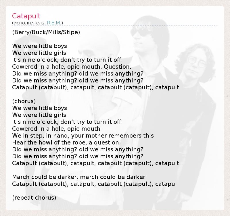 (Berry/Buck/Mills/Stipe) We were little boys We were little girls It's nine o'clock, don't try to turn it off Cowered in a hole, opie mouth. Question: Did we miss anything? did we miss anything? Did we miss anything? did we miss anything? Catapult (catapult), catapult, catapult (catapult), catapult (chorus) We were little boys We were little girls It's nine o'clock, don't try to turn it off Cowered in a hole, opie mouth We in step, in hand, your mother remembers this Hear the howl of the rope, a question: Did we miss anything? did we miss anything? Did we miss anything? did we miss anything? Catapult (catapult), catapult, catapult (catapult), catapult March could be darker, march could be darker Catapult (catapult), catapult, catapult (catapult), catapul (repeat chorus)