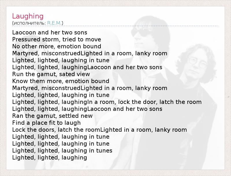 Laocoon and her two sons Pressured storm, tried to move No other more, emotion bound Martyred, misconstruedLighted in a room, lanky room Lighted, lighted, laughing in tune Lighted, lighted, laughingLaocoon and her two sons Run the gamut, sated view Know them more, emotion bound Martyred, misconstruedLighted in a room, lanky room Lighted, lighted, laughing in tune Lighted, lighted, laughingIn a room, lock the door, latch the room Lighted, lighted, laughingLaocoon and her two sons Ran the gamut, settled new Find a place fit to laugh Lock the doors, latch the roomLighted in a room, lanky room Lighted, lighted, laughing in tune Lighted, lighted, laughing in tune Lighted, lighted, laughing in tunes Lighted, lighted, laughing