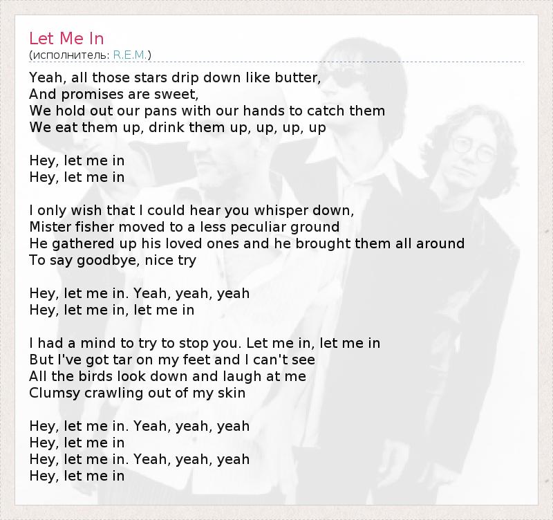 Да, все эти звезды капают, как масло, А обещания сладки. Мы протягиваем кастрюли с руками, чтобы собрать их, Мы едим и пьем их, едим и пьем их... Эй, впусти меня! Эй, впусти меня! Мне хочется лишь, чтобы я мог слушать твой шепот, Мистер рыбак перешёл на менее странную почву. Он собрал всех близких, усадил вокруг, Чтоб сказать "Прощай", как мило. Эй, впусти меня! Да, да, да! Эй, впусти меня! Впусти меня! У меня была мысль остановить тебя. Впусти меня, впусти меня. Но у меня ноги в вязкой смоле, и я ничего не вижу, Все птицы смотрят на меня и смеются, Неуклюже выползаю из кожи. Эй, впусти меня! Да, да, да! Эй, впусти меня! Эй, впусти меня! Да, да, да! Эй, впусти меня!