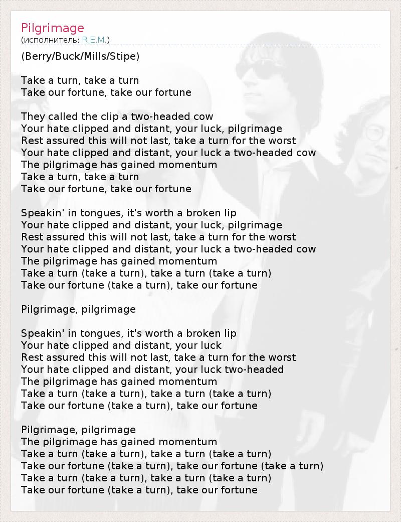 (Berry/Buck/Mills/Stipe) Take a turn, take a turn Take our fortune, take our fortune They called the clip a two-headed cow Your hate clipped and distant, your luck, pilgrimage Rest assured this will not last, take a turn for the worst Your hate clipped and distant, your luck a two-headed cow The pilgrimage has gained momentum Take a turn, take a turn Take our fortune, take our fortune Speakin' in tongues, it's worth a broken lip Your hate clipped and distant, your luck, pilgrimage Rest assured this will not last, take a turn for the worst Your hate clipped and distant, your luck a two-headed cow The pilgrimage has gained momentum Take a turn (take a turn), take a turn (take a turn) Take our fortune (take a turn), take our fortune Pilgrimage, pilgrimage Speakin' in tongues, it's worth a broken lip Your hate clipped and distant, your luck Rest assured this will not last, take a turn for the worst Your hate clipped and distant, your luck two-headed The pilgrimage has gained momentum Take a turn (take a turn), take a turn (take a turn) Take our fortune (take a turn), take our fortune Pilgrimage, pilgrimage The pilgrimage has gained momentum Take a turn (take a turn), take a turn (take a turn) Take our fortune (take a turn), take our fortune (take a turn) Take a turn (take a turn), take a turn (take a turn) Take our fortune (take a turn), take our fortune