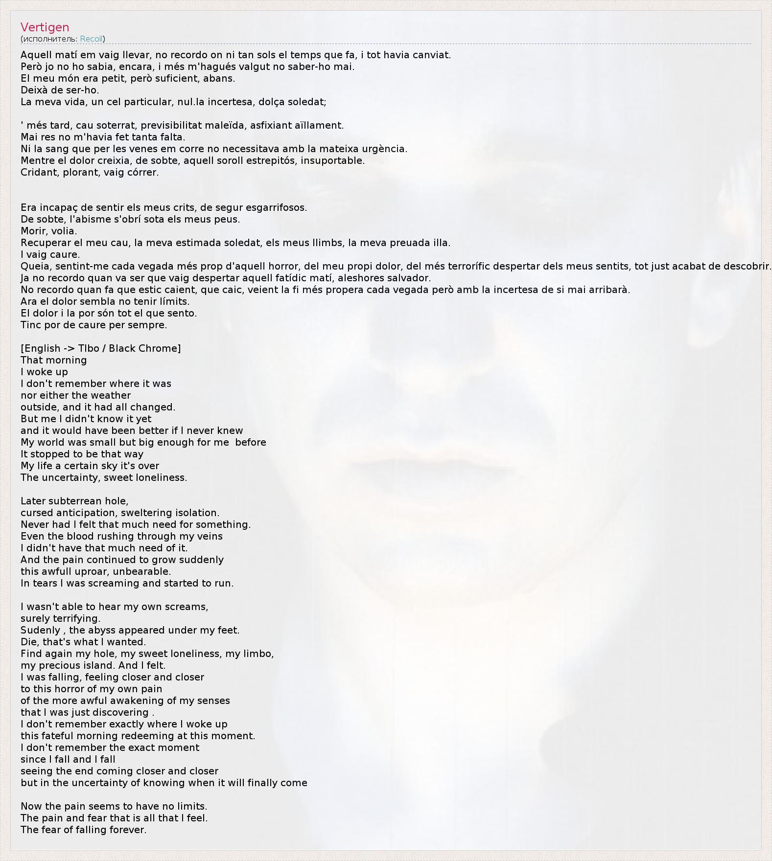Aquell matí em vaig llevar, no recordo on ni tan sols el temps que fa, i tot havia canviat. Però jo no ho sabia, encara, i més m'hagués valgut no saber-ho mai. El meu món era petit, però suficient, abans. Deixà de ser-ho. La meva vida, un cel particular, nul.la incertesa, dolça soledat; ' més tard, cau soterrat, previsibilitat maleïda, asfixiant aïllament. Mai res no m'havia fet tanta falta. Ni la sang que per les venes em corre no necessitava amb la mateixa urgència. Mentre el dolor creixia, de sobte, aquell soroll estrepitós, insuportable. Cridant, plorant, vaig córrer. Era incapaç de sentir els meus crits, de segur esgarrifosos. De sobte, l'abisme s'obrí sota els meus peus. Morir, volia. Recuperar el meu cau, la meva estimada soledat, els meus llimbs, la meva preuada illa. I vaig caure. Queia, sentint-me cada vegada més prop d'aquell horror, del meu propi dolor, del més terrorífic despertar dels meus sentits, tot just acabat de descobrir. Ja no recordo quan va ser que vaig despertar aquell fatídic matí, aleshores salvador. No recordo quan fa que estic caient, que caic, veient la fi més propera cada vegada però amb la incertesa de si mai arribarà. Ara el dolor sembla no tenir límits. El dolor i la por són tot el que sento. Tinc por de caure per sempre. [English -> TIbo / Black Chrome] That morning I woke up I don't remember where it was nor either the weather outside, and it had all changed. But me I didn't know it yet and it would have been better if I never knew My world was small but big enough for me before It stopped to be that way My life a certain sky it's over The uncertainty, sweet loneliness. Later subterrean hole, cursed anticipation, sweltering isolation. Never had I felt that much need for something. Even the blood rushing through my veins I didn't have that much need of it. And the pain continued to grow suddenly this awfull uproar, unbearable. In tears I was screaming and started to run. I wasn't able to hear my own screams, surely terrifying. Sudenly , the abyss appeared under my feet. Die, that's what I wanted. Find again my hole, my sweet loneliness, my limbo, my precious island. And I felt. I was falling, feeling closer and closer to this horror of my own pain of the more awful awakening of my senses that I was just discovering . I don't remember exactly where I woke up this fateful morning redeeming at this moment. I don't remember the exact moment since I fall and I fall seeing the end coming closer and closer but in the uncertainty of knowing when it will finally come Now the pain seems to have no limits. The pain and fear that is all that I feel. The fear of falling forever.