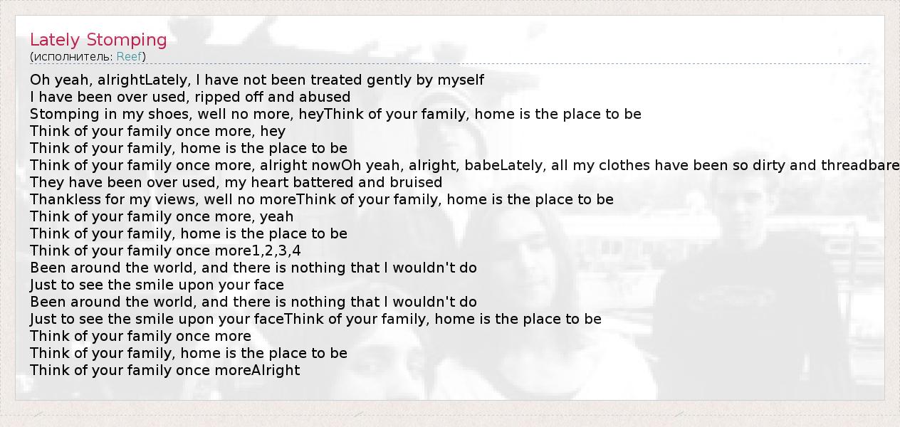 Stomping in my shoes, well no more, heyThink of your family, home is the place to be