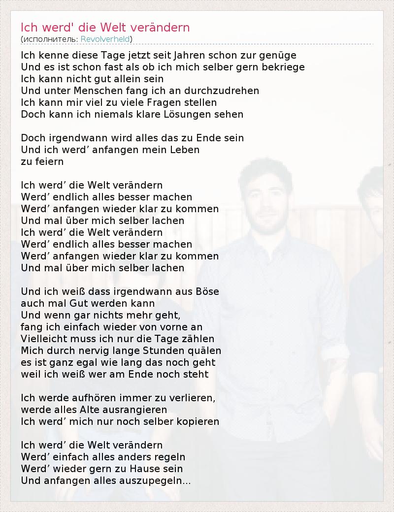 Я изменю мир На протяжении лет узнал я эти дни очень хорошо, Дошло до того, что я почти готов сам себя объявить войну. Я не могу быть один. Я начал оглядываться, когда нахожусь среди людей. Задаю себе много, слишком много вопросов, Но не могу никогда найти вразумительного ответа. Но когда-нибудь всему придет конец И я начну проживать мою жизнь так, Будто бы она была праздником. Я изменю мир, Наконец-то сделаю всё лучше, Попытаюсь всё прояснить И просто посмеяться над собой. Я изменю мир, Наконец-то сделаю всё лучше, Попытаюсь всё прояснить И просто посмеяться над собой. Знаю, что когда-нибудь зло сможет породить добро, Когда ничего больше не удается, надо всё начать сначала. Может, стоит жить лишь одним днем, Или страдать из-за каждого напряженного часа? Без разницы как долго всё будет продолжаться, Ведь я знаю, кто меня ожидает в конце. Я перестану вновь и вновь терять, пересмотрю всё то, что прежде было, Буду сам себе подражать. Я изменю мир, Сделаю всё по-другому, Вновь с удовольствием буду оставаться дома, Начну все взвешивать…