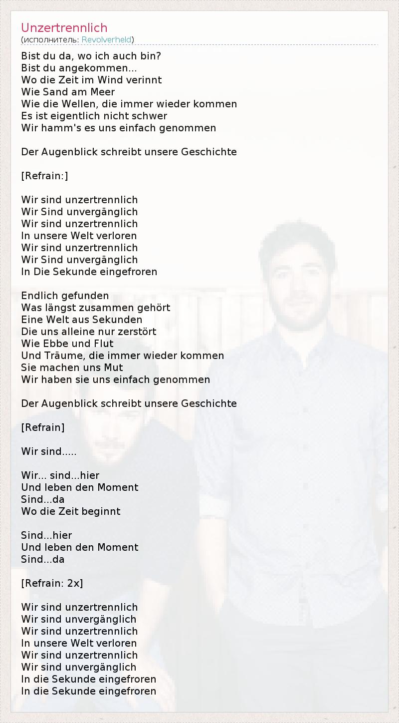 Bist du da, wo ich auch bin? Bist du angekommen... Wo die Zeit im Wind verinnt Wie Sand am Meer Wie die Wellen, die immer wieder kommen Es ist eigentlich nicht schwer Wir hamm's es uns einfach genommen Der Augenblick schreibt unsere Geschichte [Refrain:] Wir sind unzertrennlich Wir Sind unvergänglich Wir sind unzertrennlich In unsere Welt verloren Wir sind unzertrennlich Wir Sind unvergänglich In Die Sekunde eingefroren Endlich gefunden Was längst zusammen gehört Eine Welt aus Sekunden Die uns alleine nur zerstört Wie Ebbe und Flut Und Träume, die immer wieder kommen Sie machen uns Mut Wir haben sie uns einfach genommen Der Augenblick schreibt unsere Geschichte [Refrain] Wir sind..... Wir... sind...hier Und leben den Moment Sind...da Wo die Zeit beginnt Sind...hier Und leben den Moment Sind...da [Refrain: 2x] Wir sind unzertrennlich Wir sind unvergänglich Wir sind unzertrennlich In unsere Welt verloren Wir sind unzertrennlich Wir sind unvergänglich In die Sekunde eingefroren In die Sekunde eingefroren