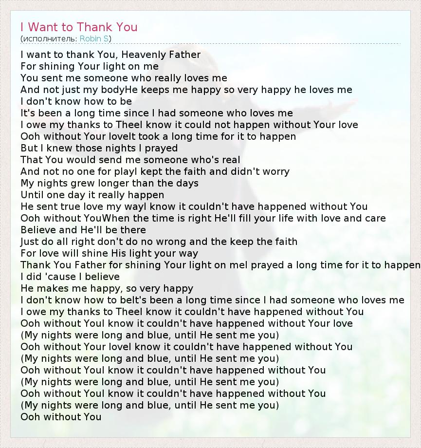 I want to thank You, Heavenly Father For shining Your light on me You sent me someone who really loves me And not just my bodyHe keeps me happy so very happy he loves me I don't know how to be It's been a long time since I had someone who loves me I owe my thanks to TheeI know it could not happen without Your love Ooh without Your loveIt took a long time for it to happen But I knew those nights I prayed That You would send me someone who's real And not no one for playI kept the faith and didn't worry My nights grew longer than the days Until one day it really happen He sent true love my wayI know it couldn't have happened without You Ooh without YouWhen the time is right He'll fill your life with love and care Believe and He'll be there Just do all right don't do no wrong and the keep the faith For love will shine His light your way Thank You Father for shining Your light on meI prayed a long time for it to happen I did 'cause I believe He makes me happy, so very happy I don't know how to beIt's been a long time since I had someone who loves me I owe my thanks to TheeI know it couldn't have happened without You Ooh without YouI know it couldn't have happened without Your love (My nights were long and blue, until He sent me you) Ooh without Your loveI know it couldn't have happened without You (My nights were long and blue, until He sent me you) Ooh without YouI know it couldn't have happened without You (My nights were long and blue, until He sent me you) Ooh without YouI know it couldn't have happened without You (My nights were long and blue, until He sent me you) Ooh without You