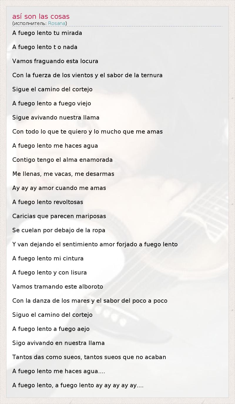A fuego lento tu mirada A fuego lento t o nada Vamos fraguando esta locura Con la fuerza de los vientos y el sabor de la ternura Sigue el camino del cortejo A fuego lento a fuego viejo Sigue avivando nuestra llama Con todo lo que te quiero y lo mucho que me amas A fuego lento me haces agua Contigo tengo el alma enamorada Me llenas, me vacas, me desarmas Ay ay ay amor cuando me amas A fuego lento revoltosas Caricias que parecen mariposas Se cuelan por debajo de la ropa Y van dejando el sentimiento amor forjado a fuego lento A fuego lento mi cintura A fuego lento y con lisura Vamos tramando este alboroto Con la danza de los mares y el sabor del poco a poco Siguo el camino del cortejo A fuego lento a fuego aejo Sigo avivando en nuestra llama Tantos das como sueos, tantos sueos que no acaban A fuego lento me haces agua.... A fuego lento, a fuego lento ay ay ay ay ay....
