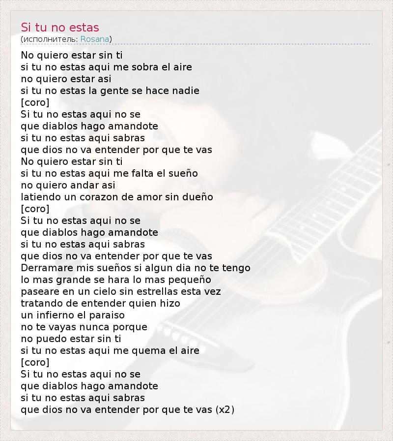No quiero estar sin ti si tu no estas aqui me sobra el aire no quiero estar asi si tu no estas la gente se hace nadie [coro] Si tu no estas aqui no se que diablos hago amandote si tu no estas aqui sabras que dios no va entender por que te vas No quiero estar sin ti si tu no estas aqui me falta el sueño no quiero andar asi latiendo un corazon de amor sin dueño [coro] Si tu no estas aqui no se que diablos hago amandote si tu no estas aqui sabras que dios no va entender por que te vas Derramare mis sueños si algun dia no te tengo lo mas grande se hara lo mas pequeño paseare en un cielo sin estrellas esta vez tratando de entender quien hizo un infierno el paraiso no te vayas nunca porque no puedo estar sin ti si tu no estas aqui me quema el aire [coro] Si tu no estas aqui no se que diablos hago amandote si tu no estas aqui sabras que dios no va entender por que te vas (x2)