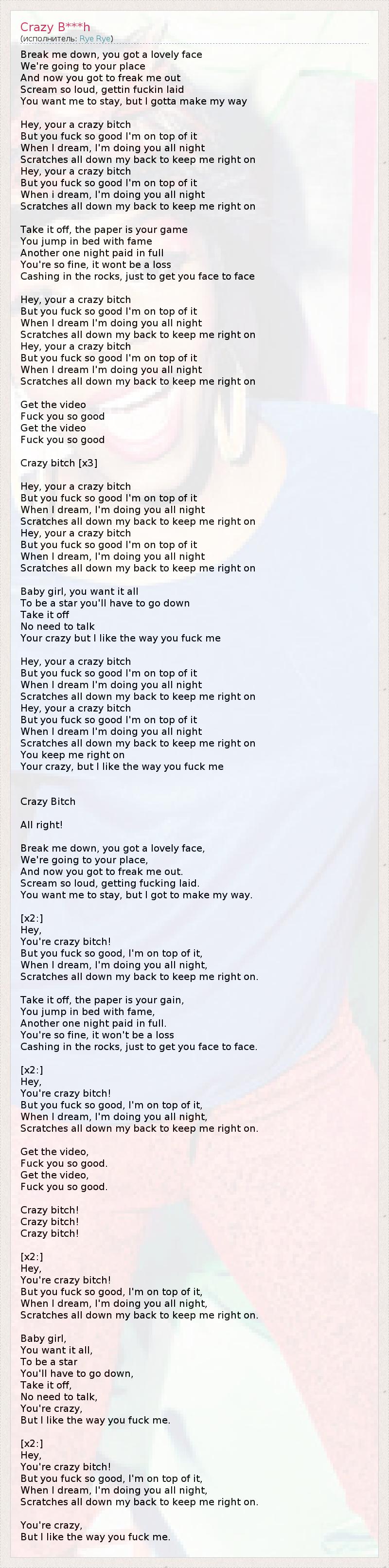 Break me down, you got a lovely face We're going to your place And now you got to freak me out Scream so loud, gettin fuckin laid You want me to stay, but I gotta make my way Hey, your a crazy bitch But you fuck so good I'm on top of it When I dream, I'm doing you all night Scratches all down my back to keep me right on Hey, your a crazy bitch But you fuck so good I'm on top of it When i dream, I'm doing you all night Scratches all down my back to keep me right on Take it off, the paper is your game You jump in bed with fame Another one night paid in full You're so fine, it wont be a loss Cashing in the rocks, just to get you face to face Hey, your a crazy bitch But you fuck so good I'm on top of it When I dream I'm doing you all night Scratches all down my back to keep me right on Hey, your a crazy bitch But you fuck so good I'm on top of it When I dream I'm doing you all night Scratches all down my back to keep me right on Get the video Fuck you so good Get the video Fuck you so good Crazy bitch [х3] Hey, your a crazy bitch But you fuck so good I'm on top of it When I dream, I'm doing you all night Scratches all down my back to keep me right on Hey, your a crazy bitch But you fuck so good I'm on top of it When I dream, I'm doing you all night Scratches all down my back to keep me right on Baby girl, you want it all To be a star you'll have to go down Take it off No need to talk Your crazy but I like the way you fuck me Hey, your a crazy bitch But you fuck so good I'm on top of it When I dream I'm doing you all night Scratches all down my back to keep me right on Hey, your a crazy bitch But you fuck so good I'm on top of it When I dream I'm doing you all night Scratches all down my back to keep me right on You keep me right on Your crazy, but I like the way you fuck me Crazy Bitch All right! Break me down, you got a lovely face, We're going to your place, And now you got to freak me out. Scream so loud, getting fucking laid. You want me to stay, but I got to make my way. [x2:] Hey, You're crazy bitch! But you fuck so good, I'm on top of it, When I dream, I'm doing you all night, Scratches all down my back to keep me right on. Take it off, the paper is your gain, You jump in bed with fame, Another one night paid in full. You're so fine, it won't be a loss Cashing in the rocks, just to get you face to face. [x2:] Hey, You're crazy bitch! But you fuck so good, I'm on top of it, When I dream, I'm doing you all night, Scratches all down my back to keep me right on. Get the video, Fuck you so good. Get the video, Fuck you so good. Crazy bitch! Crazy bitch! Crazy bitch! [x2:] Hey, You're crazy bitch! But you fuck so good, I'm on top of it, When I dream, I'm doing you all night, Scratches all down my back to keep me right on. Baby girl, You want it all, To be a star You'll have to go down, Take it off, No need to talk, You're crazy, But I like the way you fuck me. [x2:] Hey, You're crazy bitch! But you fuck so good, I'm on top of it, When I dream, I'm doing you all night, Scratches all down my back to keep me right on. You're crazy, But I like the way you fuck me.