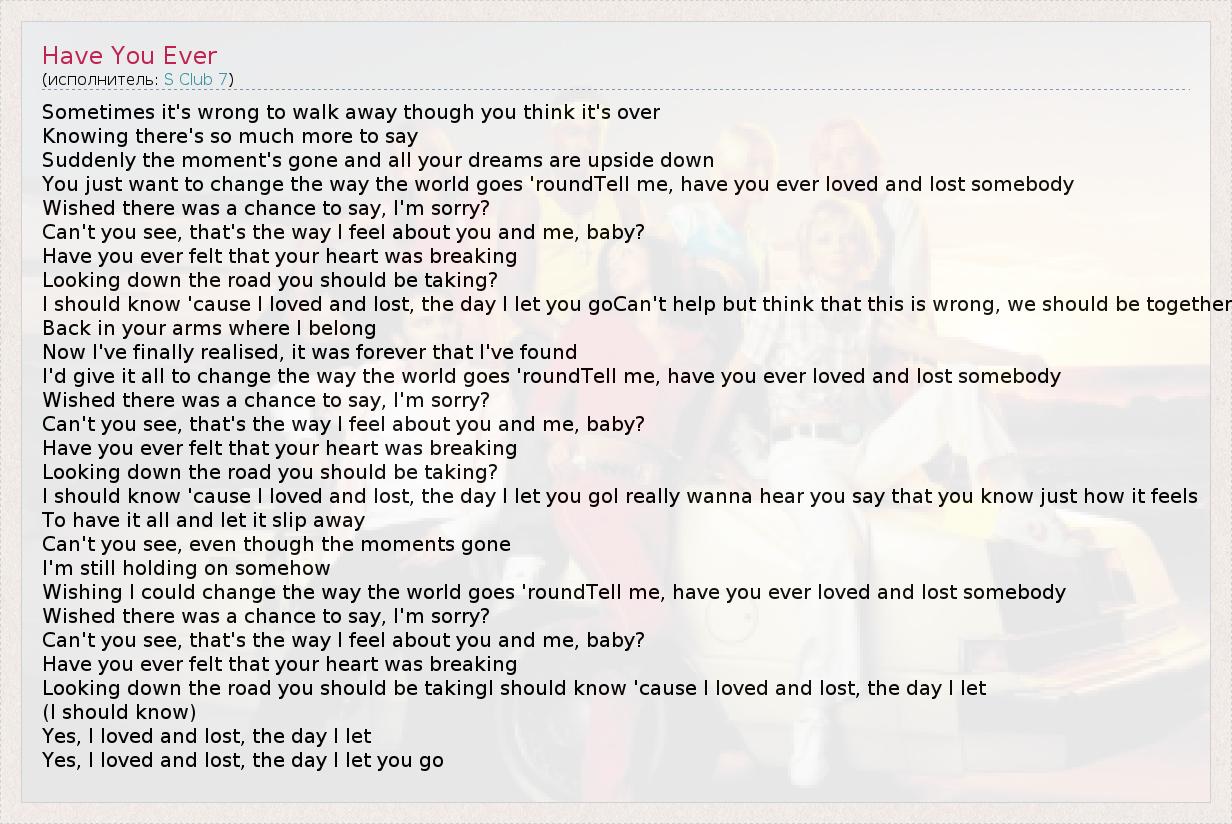 Sometimes it's wrong to walk away though you think it's over Knowing there's so much more to say Suddenly the moment's gone and all your dreams are upside down You just want to change the way the world goes 'roundTell me, have you ever loved and lost somebody Wished there was a chance to say, I'm sorry? Can't you see, that's the way I feel about you and me, baby? Have you ever felt that your heart was breaking Looking down the road you should be taking? I should know 'cause I loved and lost, the day I let you goCan't help but think that this is wrong, we should be together Back in your arms where I belong Now I've finally realised, it was forever that I've found I'd give it all to change the way the world goes 'roundTell me, have you ever loved and lost somebody Wished there was a chance to say, I'm sorry? Can't you see, that's the way I feel about you and me, baby? Have you ever felt that your heart was breaking Looking down the road you should be taking? I should know 'cause I loved and lost, the day I let you goI really wanna hear you say that you know just how it feels To have it all and let it slip away Can't you see, even though the moments gone I'm still holding on somehow Wishing I could change the way the world goes 'roundTell me, have you ever loved and lost somebody Wished there was a chance to say, I'm sorry? Can't you see, that's the way I feel about you and me, baby? Have you ever felt that your heart was breaking Looking down the road you should be takingI should know 'cause I loved and lost, the day I let (I should know) Yes, I loved and lost, the day I let Yes, I loved and lost, the day I let you go
