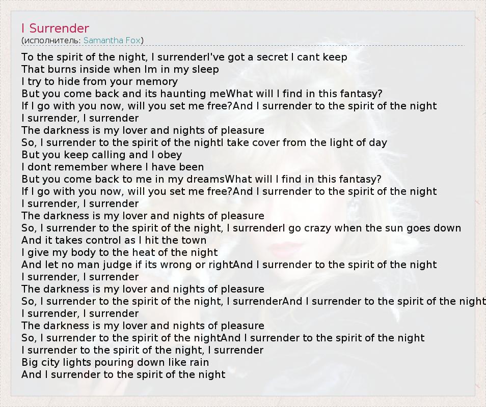 So, I surrender to the spirit of the night, I surrenderAnd I surrender to the spirit of the night
