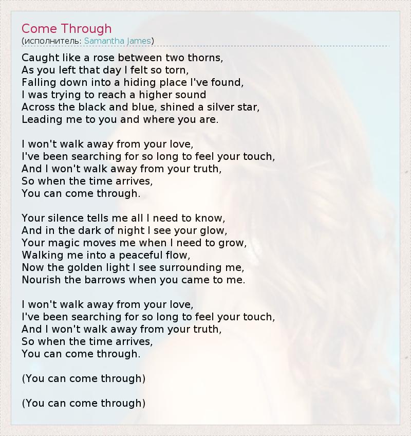Caught like a rose between two thorns, As you left that day I felt so torn, Falling down into a hiding place I've found, I was trying to reach a higher sound Across the black and blue, shined a silver star, Leading me to you and where you are. I won't walk away from your love, I've been searching for so long to feel your touch, And I won't walk away from your truth, So when the time arrives, You can come through. Your silence tells me all I need to know, And in the dark of night I see your glow, Your magic moves me when I need to grow, Walking me into a peaceful flow, Now the golden light I see surrounding me, Nourish the barrows when you came to me. I won't walk away from your love, I've been searching for so long to feel your touch, And I won't walk away from your truth, So when the time arrives, You can come through. (You can come through) (You can come through)