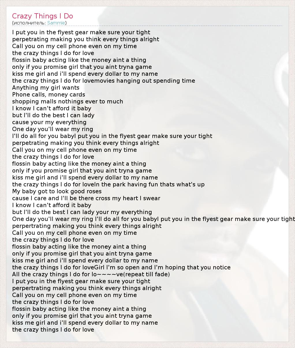 I put you in the flyest gear make sure your tight perpetrating making you think every things alright Call you on my cell phone even on my time the crazy things I do for love flossin baby acting like the money aint a thing only if you promise girl that you aint tryna game kiss me girl and i'll spend every dollar to my name the crazy things I do for lovemovies hanging out spending time Anything my girl wants Phone calls, money cards shopping malls nothings ever to much I know I can't afford it baby but I'll do the best I can lady cause your my everything One day you'll wear my ring I'll do all for you babyI put you in the flyest gear make sure your tight perpetrating making you think every things alright Call you on my cell phone even on my time the crazy things I do for love flossin baby acting like the money aint a thing only if you promise girl that you aint tryna game kiss me girl and i'll spend every dollar to my name the crazy things I do for loveIn the park having fun thats what's up My baby got to look good roses cause I care and I'll be there cross my heart I swear I know I can't afford it baby but I'll do the best I can lady your my everything One day you'll wear my ring I'll do all for you babyI put you in the flyest gear make sure your tight perpertrating making you think every things alright Call you on my cell phone even on my time the crazy things I do for love flossin baby acting like the money aint a thing only if you promise girl that you aint tryna game kiss me girl and i'll spend every dollar to my name the crazy things I do for loveGirl I'm so open and I'm hoping that you notice All the crazy things I do for lo~~~~ve(repeat till fade) I put you in the flyest gear make sure your tight perpertrating making you think every things alright Call you on my cell phone even on my time the crazy things I do for love flossin baby acting like the money aint a thing only if you promise girl that you aint tryna game kiss me girl and i'll spend every dollar to my name the crazy things I do for love