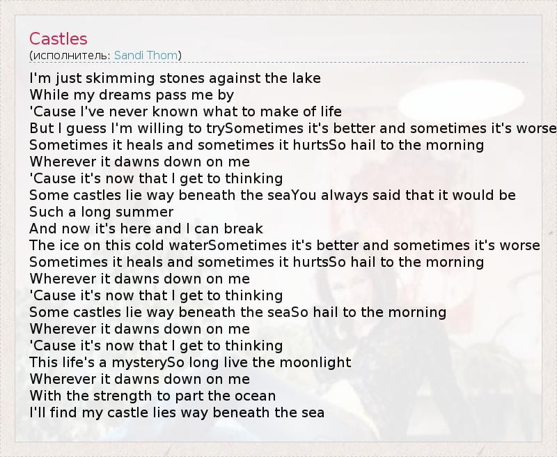 Это интересно:Вдохновляющий дебют Сэнди ТомАлександрия Том родилась в августе 1981 года в городке Банфф, в Шотландии. Во время учебы в школе она три года пела и играла на клавишных в группе The Residents, а затем пела в хоре духовной музыки Love and Joy и в группе без названия. Как-то раз Сэнди написала а капельный сингл I Wish I Was A Punk Rocker (With Flowers In My Hair) и всего за одну неделю он оказался на вершине списка мировых хитов.... продолжение