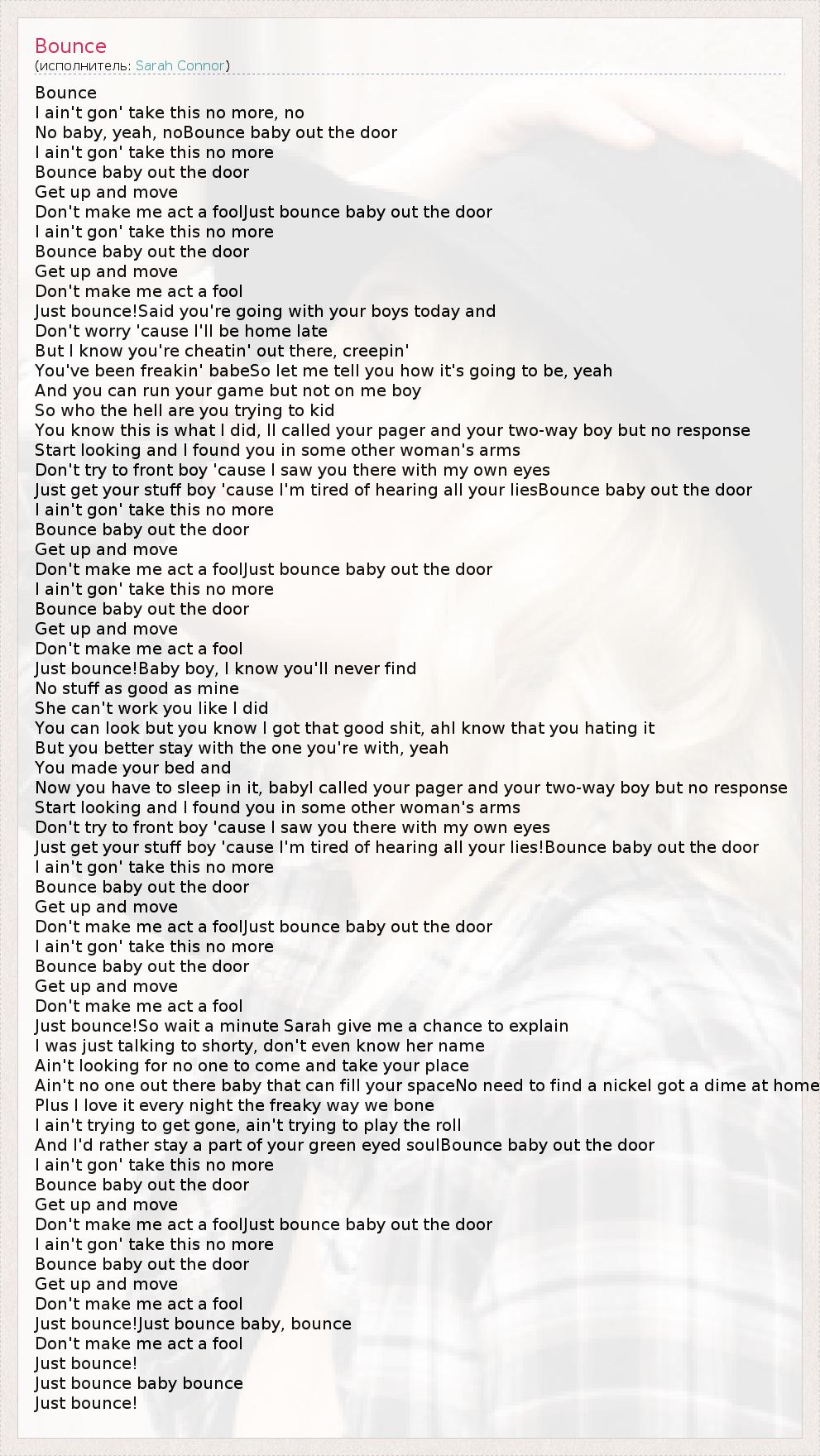 Bounce I ain't gon' take this no more, no No baby, yeah, noBounce baby out the door I ain't gon' take this no more Bounce baby out the door Get up and move Don't make me act a foolJust bounce baby out the door I ain't gon' take this no more Bounce baby out the door Get up and move Don't make me act a fool Just bounce!Said you're going with your boys today and Don't worry 'cause I'll be home late But I know you're cheatin' out there, creepin' You've been freakin' babeSo let me tell you how it's going to be, yeah And you can run your game but not on me boy So who the hell are you trying to kid You know this is what I did, II called your pager and your two-way boy but no response Start looking and I found you in some other woman's arms Don't try to front boy 'cause I saw you there with my own eyes Just get your stuff boy 'cause I'm tired of hearing all your liesBounce baby out the door I ain't gon' take this no more Bounce baby out the door Get up and move Don't make me act a foolJust bounce baby out the door I ain't gon' take this no more Bounce baby out the door Get up and move Don't make me act a fool Just bounce!Baby boy, I know you'll never find No stuff as good as mine She can't work you like I did You can look but you know I got that good shit, ahI know that you hating it But you better stay with the one you're with, yeah You made your bed and Now you have to sleep in it, babyI called your pager and your two-way boy but no response Start looking and I found you in some other woman's arms Don't try to front boy 'cause I saw you there with my own eyes Just get your stuff boy 'cause I'm tired of hearing all your lies!Bounce baby out the door I ain't gon' take this no more Bounce baby out the door Get up and move Don't make me act a foolJust bounce baby out the door I ain't gon' take this no more Bounce baby out the door Get up and move Don't make me act a fool Just bounce!So wait a minute Sarah give me a chance to explain I was just talking to shorty, don't even know her name Ain't looking for no one to come and take your place Ain't no one out there baby that can fill your spaceNo need to find a nickel got a dime at home Plus I love it every night the freaky way we bone I ain't trying to get gone, ain't trying to play the roll And I'd rather stay a part of your green eyed soulBounce baby out the door I ain't gon' take this no more Bounce baby out the door Get up and move Don't make me act a foolJust bounce baby out the door I ain't gon' take this no more Bounce baby out the door Get up and move Don't make me act a fool Just bounce!Just bounce baby, bounce Don't make me act a fool Just bounce! Just bounce baby bounce Just bounce!
