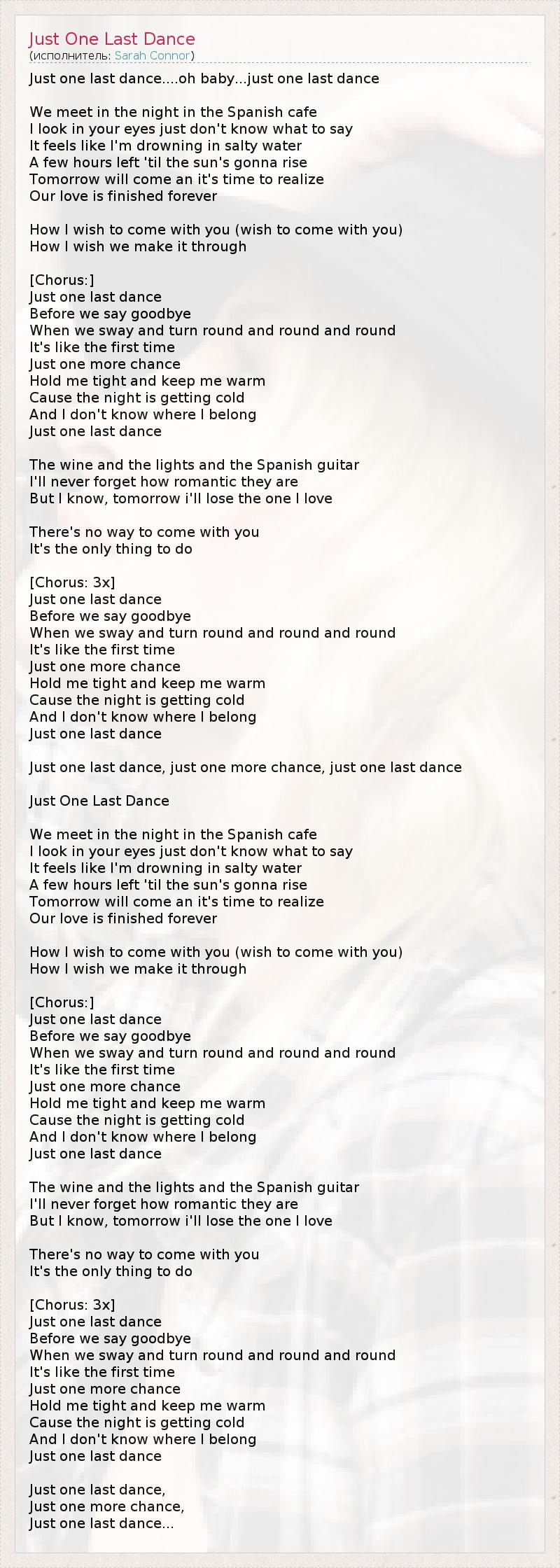 Только один последний танец, малыш… Только один последний танец. Мы встретились ночью в испанском кафе. Я смотрю тебе в глаза и не знаю, что сказать. Такое чувство, что я утопаю в океане. Через несколько часов взойдёт солнце, И наступит завтрашний день. Пора понять: Нашей любви пришёл конец. Как бы я хотела поехать с тобой (как бы хотела поехать с тобой) Как бы я хотела, чтобы это было возможно. [Припев:] Только один последний танец, Прежде чем попрощаться. Когда мы покачиваемся и кружимся, Всё словно только начинается. Это последний шанс. Обними меня крепче, согрей меня, Этой ночью так холодно. Не знаю, что мне делать. Только один последний танец. Вино, свечи, испанская гитара… Я никогда не забуду, как всё было романтично, Но я знаю, что завтра потеряю любимого. Я не смогу поехать с тобой. Единственное, что нам осталось… [Припев: 3 раза] Только один последний танец, Прежде чем попрощаться. Когда мы покачиваемся и кружимся, Всё словно только начинается. Это последний шанс. Обними меня крепче, согрей меня, Этой ночью так холодно. Не знаю, что мне делать. Только один последний танец. Только один последний танец… Лишь один последний танец (перевод Павел Монахов из Архангельска) Мы встретились ночью в испанском кафе, Смотрю я в глаза, но что сказать тебе? И чувство, как будто тону в океане Немного часов, и нужно солнцу вставать, Уж завтра наступит и пора осознать: Любви пришёл конец... Как хочу пойти с тобой (следом за тобой) и угнаться за мечтой [Припев:] Танца с тобой, Прежде чем сказать "прощай" И качаясь, и кружась, кружась, кружась Как будто в первый раз Последний шанс Обними меня, согрей, Видишь, ночь всё холодней, И я в раздумьях вместе с ней, Лишь танец с тобой... Вино и огни, и гитарный аккорд, Забыть не смогу - романтичный рекорд, Но знаю, что я завтра тебя потеряю... Нет совместного пути, Остаётся лишь пойти... [Припев: 3x] Танец с тобой, Прежде чем сказать "Прощай" И качаясь, и кружась, кружась, кружась Как будто в первый раз Последний шанс Обними меня, согрей, Видишь, ночь всё холодней, И я в раздумьях вместе с ней, Лишь танец с тобой... Танец с тобой - Последний шанс? Танец с тобой...