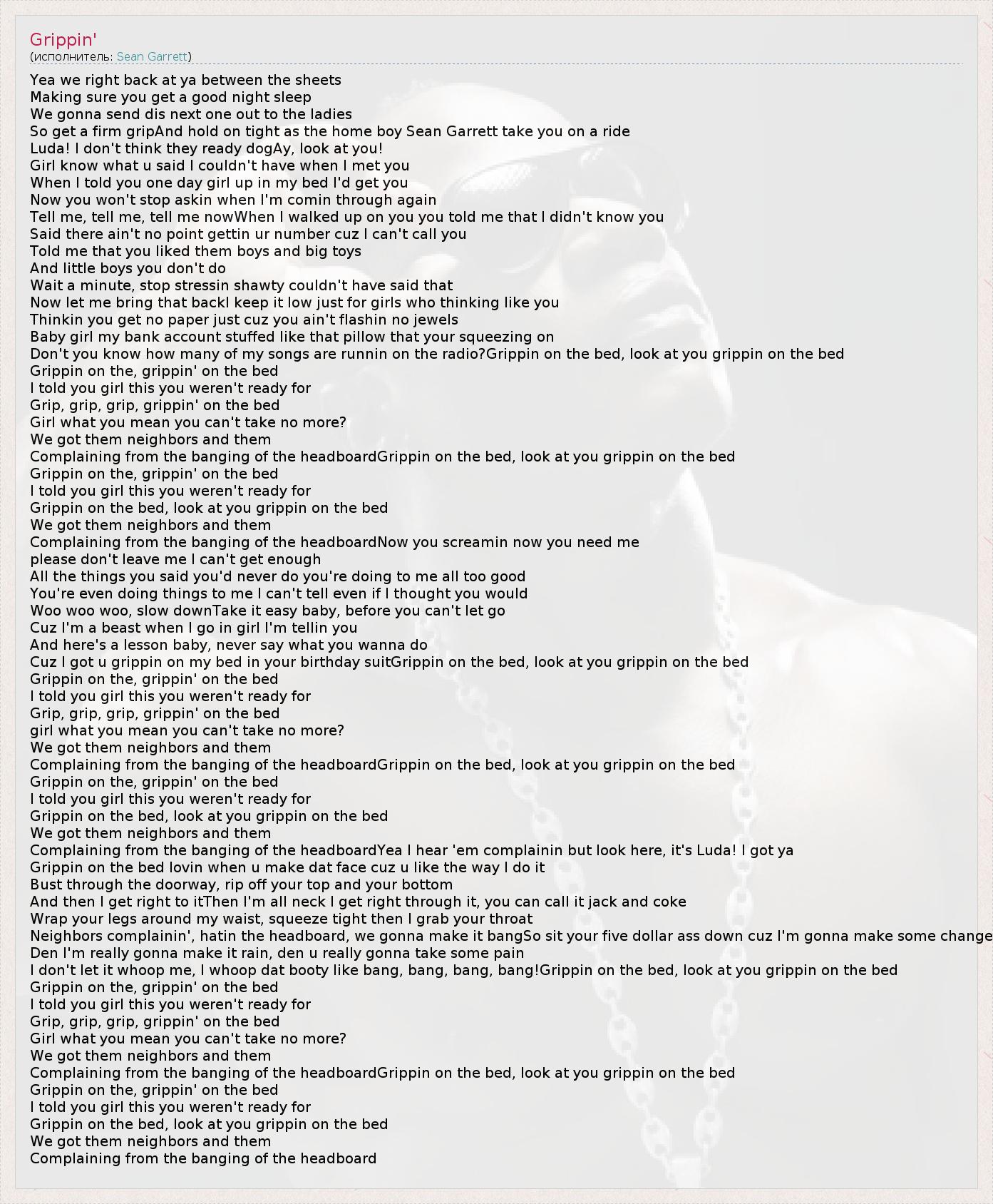 Don't you know how many of my songs are runnin on the radio?Grippin on the bed, look at you grippin on the bed