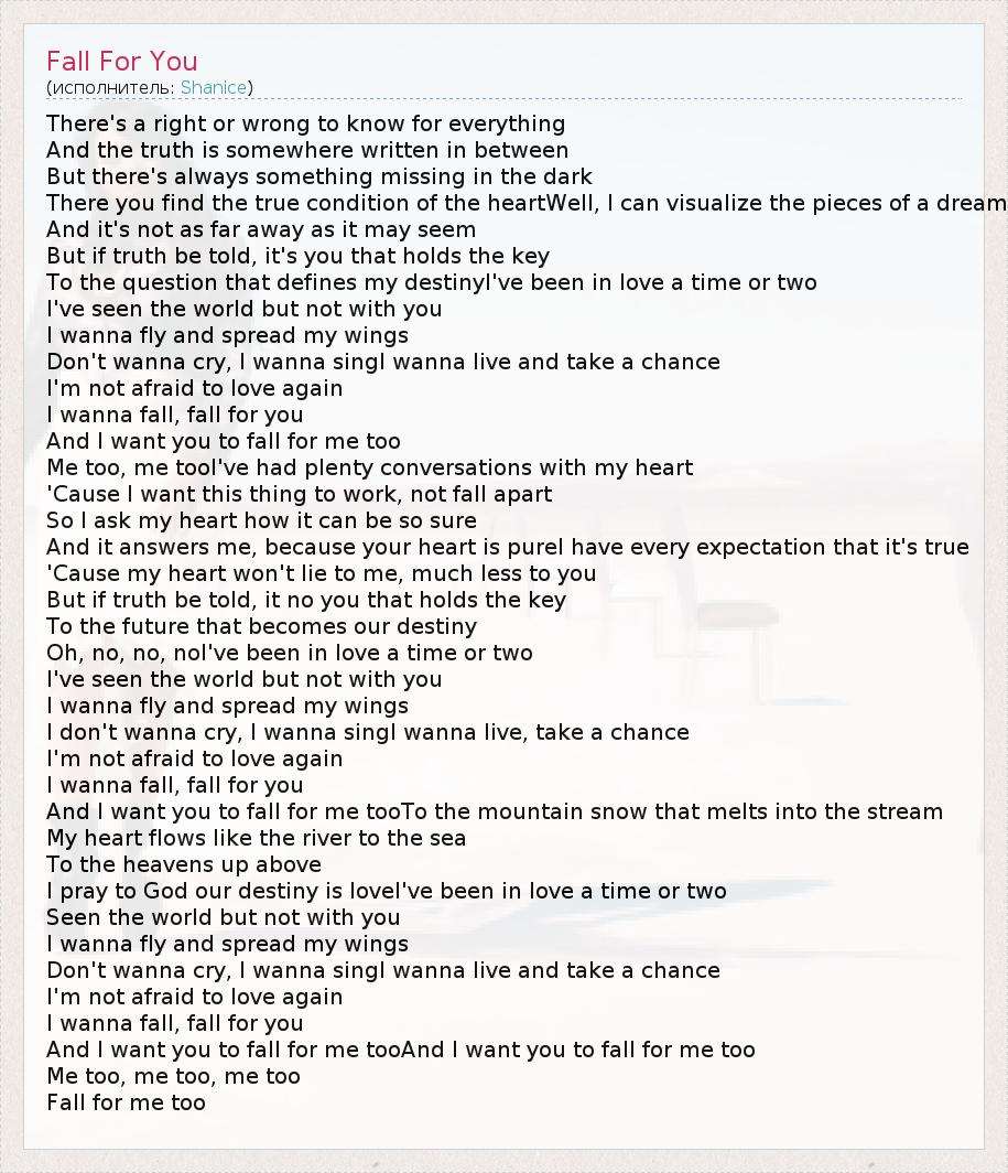 There's a right or wrong to know for everything And the truth is somewhere written in between But there's always something missing in the dark There you find the true condition of the heartWell, I can visualize the pieces of a dream And it's not as far away as it may seem But if truth be told, it's you that holds the key To the question that defines my destinyI've been in love a time or two I've seen the world but not with you I wanna fly and spread my wings Don't wanna cry, I wanna singI wanna live and take a chance I'm not afraid to love again I wanna fall, fall for you And I want you to fall for me too Me too, me tooI've had plenty conversations with my heart 'Cause I want this thing to work, not fall apart So I ask my heart how it can be so sure And it answers me, because your heart is pureI have every expectation that it's true 'Cause my heart won't lie to me, much less to you But if truth be told, it no you that holds the key To the future that becomes our destiny Oh, no, no, noI've been in love a time or two I've seen the world but not with you I wanna fly and spread my wings I don't wanna cry, I wanna singI wanna live, take a chance I'm not afraid to love again I wanna fall, fall for you And I want you to fall for me tooTo the mountain snow that melts into the stream My heart flows like the river to the sea To the heavens up above I pray to God our destiny is loveI've been in love a time or two Seen the world but not with you I wanna fly and spread my wings Don't wanna cry, I wanna singI wanna live and take a chance I'm not afraid to love again I wanna fall, fall for you And I want you to fall for me tooAnd I want you to fall for me too Me too, me too, me too Fall for me too