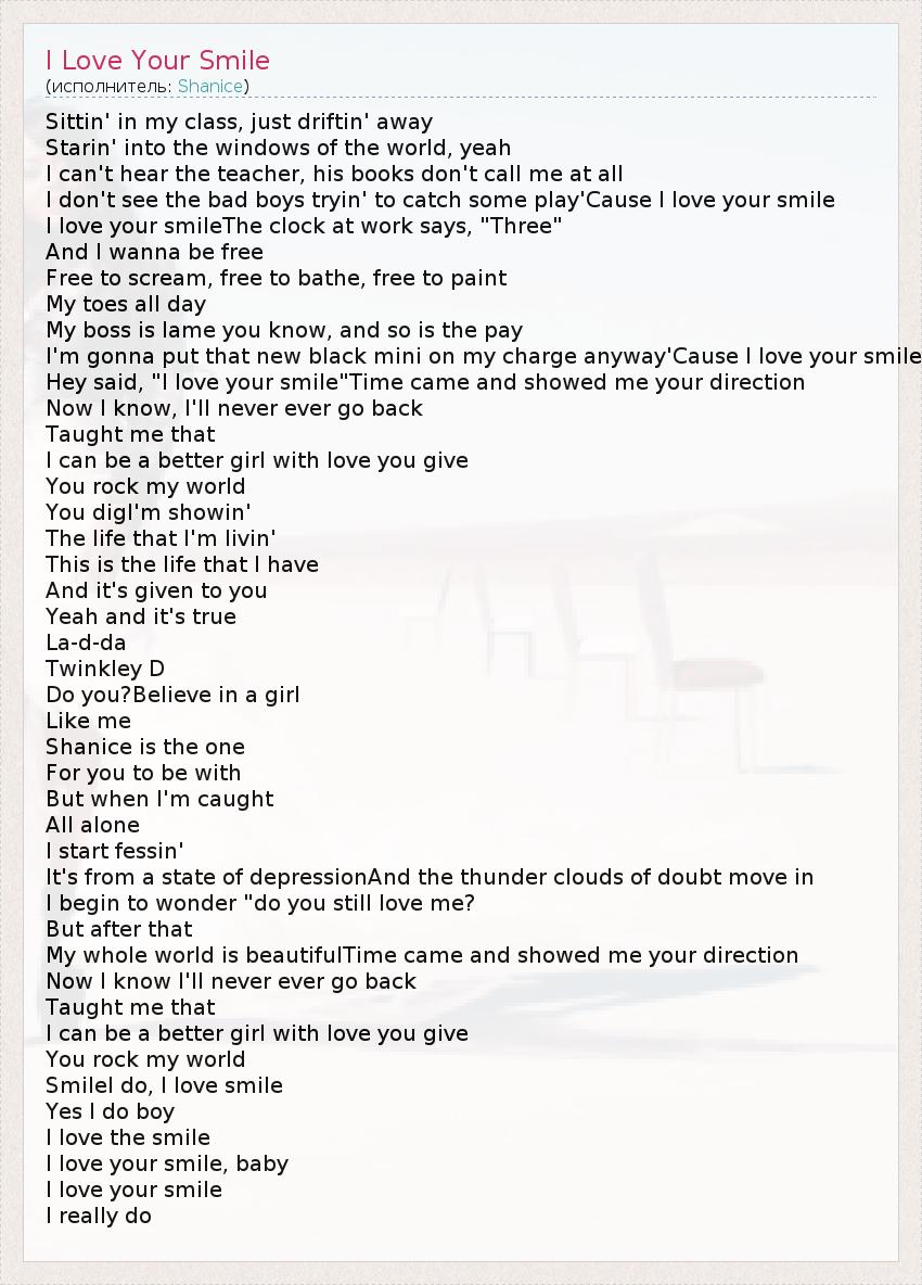 Sittin' in my class, just driftin' away Starin' into the windows of the world, yeah I can't hear the teacher, his books don't call me at all I don't see the bad boys tryin' to catch some play'Cause I love your smile I love your smileThe clock at work says, "Three" And I wanna be free Free to scream, free to bathe, free to paint My toes all day My boss is lame you know, and so is the pay I'm gonna put that new black mini on my charge anyway'Cause I love your smile Hey said, "I love your smile"Time came and showed me your direction Now I know, I'll never ever go back Taught me that I can be a better girl with love you give You rock my world You digI'm showin' The life that I'm livin' This is the life that I have And it's given to you Yeah and it's true La-d-da Twinkley D Do you?Believe in a girl Like me Shanice is the one For you to be with But when I'm caught All alone I start fessin' It's from a state of depressionAnd the thunder clouds of doubt move in I begin to wonder "do you still love me? But after that My whole world is beautifulTime came and showed me your direction Now I know I'll never ever go back Taught me that I can be a better girl with love you give You rock my world SmileI do, I love smile Yes I do boy I love the smile I love your smile, baby I love your smile I really do