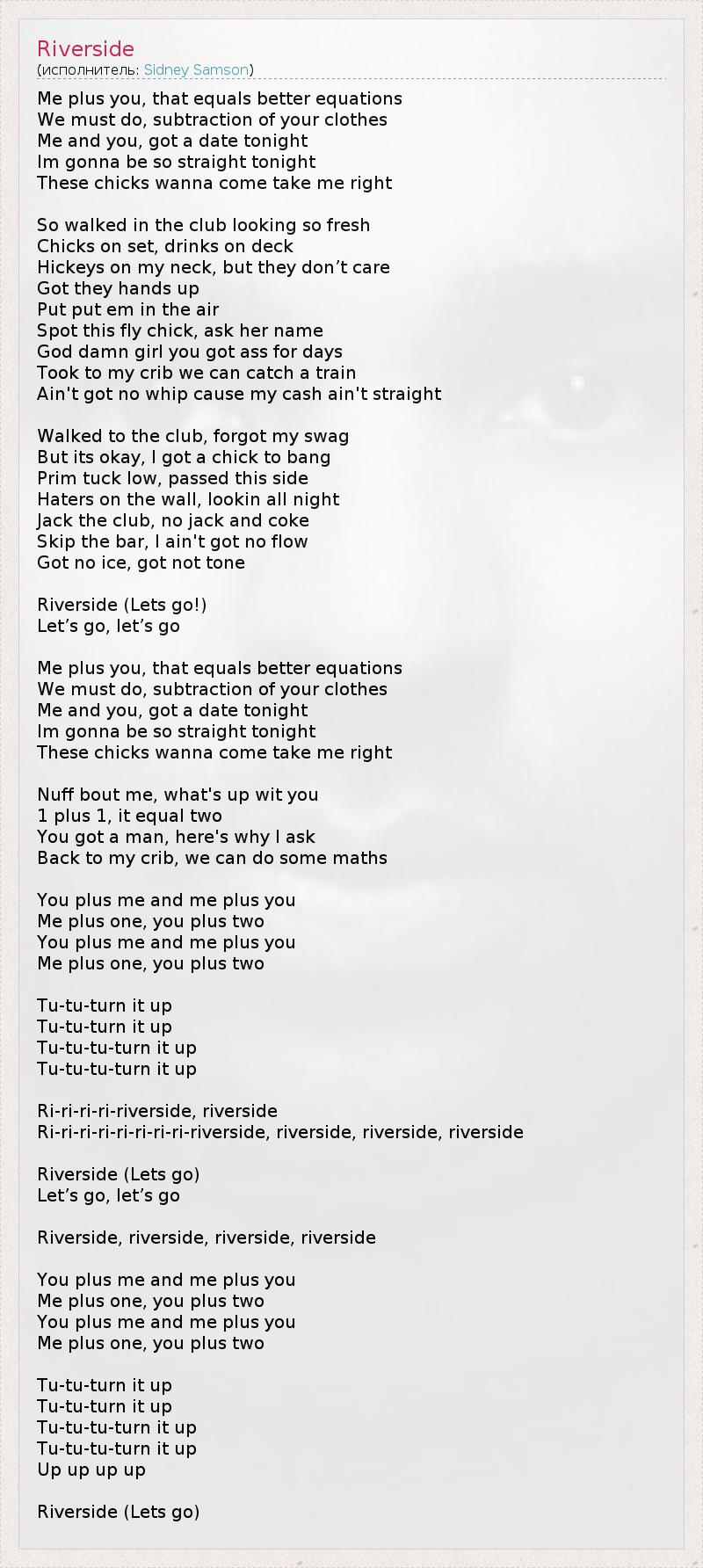 Me plus you, that equals better equations We must do, subtraction of your clothes Me and you, got a date tonight Im gonna be so straight tonight These chicks wanna come take me right So walked in the club looking so fresh Chicks on set, drinks on deck Hickeys on my neck, but they don’t care Got they hands up Put put em in the air Spot this fly chick, ask her name God damn girl you got ass for days Took to my crib we can catch a train Ain't got no whip cause my cash ain't straight Walked to the club, forgot my swag But its okay, I got a chick to bang Prim tuck low, passed this side Haters on the wall, lookin all night Jack the club, no jack and coke Skip the bar, I ain't got no flow Got no ice, got not tone Riverside (Lets go!) Let’s go, let’s go Me plus you, that equals better equations We must do, subtraction of your clothes Me and you, got a date tonight Im gonna be so straight tonight These chicks wanna come take me right Nuff bout me, what's up wit you 1 plus 1, it equal two You got a man, here's why I ask Back to my crib, we can do some maths You plus me and me plus you Me plus one, you plus two You plus me and me plus you Me plus one, you plus two Tu-tu-turn it up Tu-tu-turn it up Tu-tu-tu-turn it up Tu-tu-tu-turn it up Ri-ri-ri-ri-riverside, riverside Ri-ri-ri-ri-ri-ri-ri-ri-riverside, riverside, riverside, riverside Riverside (Lets go) Let’s go, let’s go Riverside, riverside, riverside, riverside You plus me and me plus you Me plus one, you plus two You plus me and me plus you Me plus one, you plus two Tu-tu-turn it up Tu-tu-turn it up Tu-tu-tu-turn it up Tu-tu-tu-turn it up Up up up up Riverside (Lets go)
