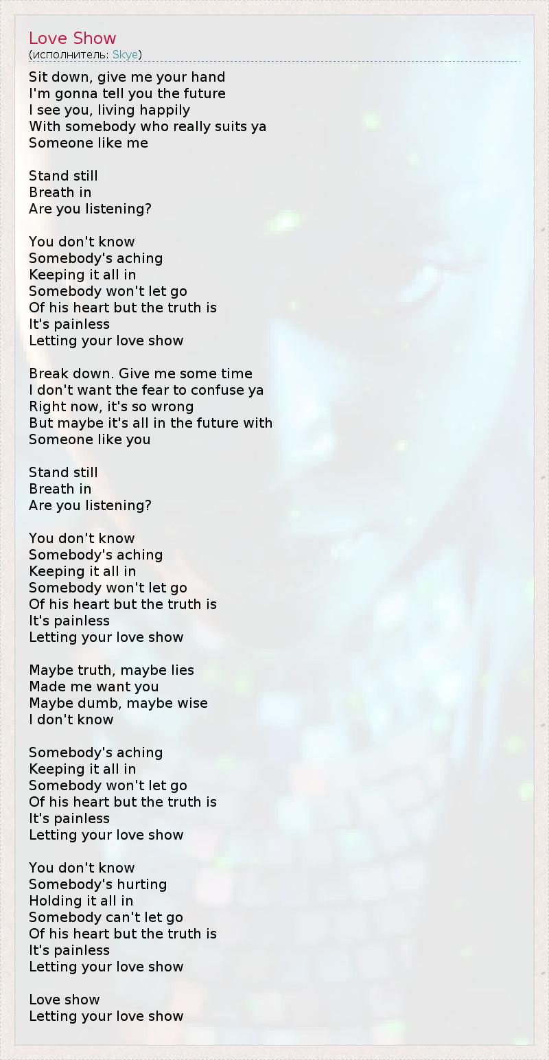Sit down, give me your hand I'm gonna tell you the future I see you, living happily With somebody who really suits ya Someone like me Stand still Breath in Are you listening? You don't know Somebody's aching Keeping it all in Somebody won't let go Of his heart but the truth is It's painless Letting your love show Break down. Give me some time I don't want the fear to confuse ya Right now, it's so wrong But maybe it's all in the future with Someone like you Stand still Breath in Are you listening? You don't know Somebody's aching Keeping it all in Somebody won't let go Of his heart but the truth is It's painless Letting your love show Maybe truth, maybe lies Made me want you Maybe dumb, maybe wise I don't know Somebody's aching Keeping it all in Somebody won't let go Of his heart but the truth is It's painless Letting your love show You don't know Somebody's hurting Holding it all in Somebody can't let go Of his heart but the truth is It's painless Letting your love show Love show Letting your love show