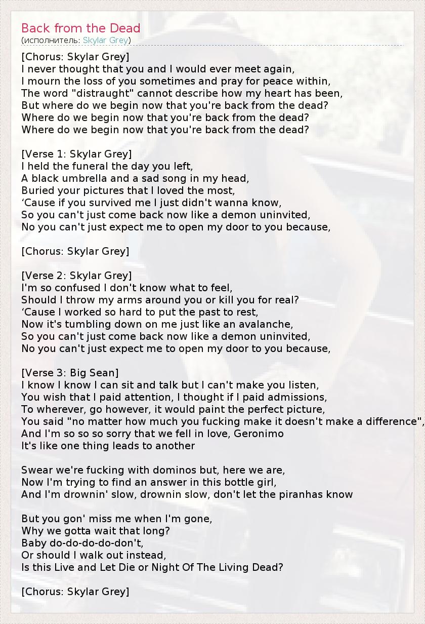 А как ты думаешь, о чем песня "Back from the Dead" ?