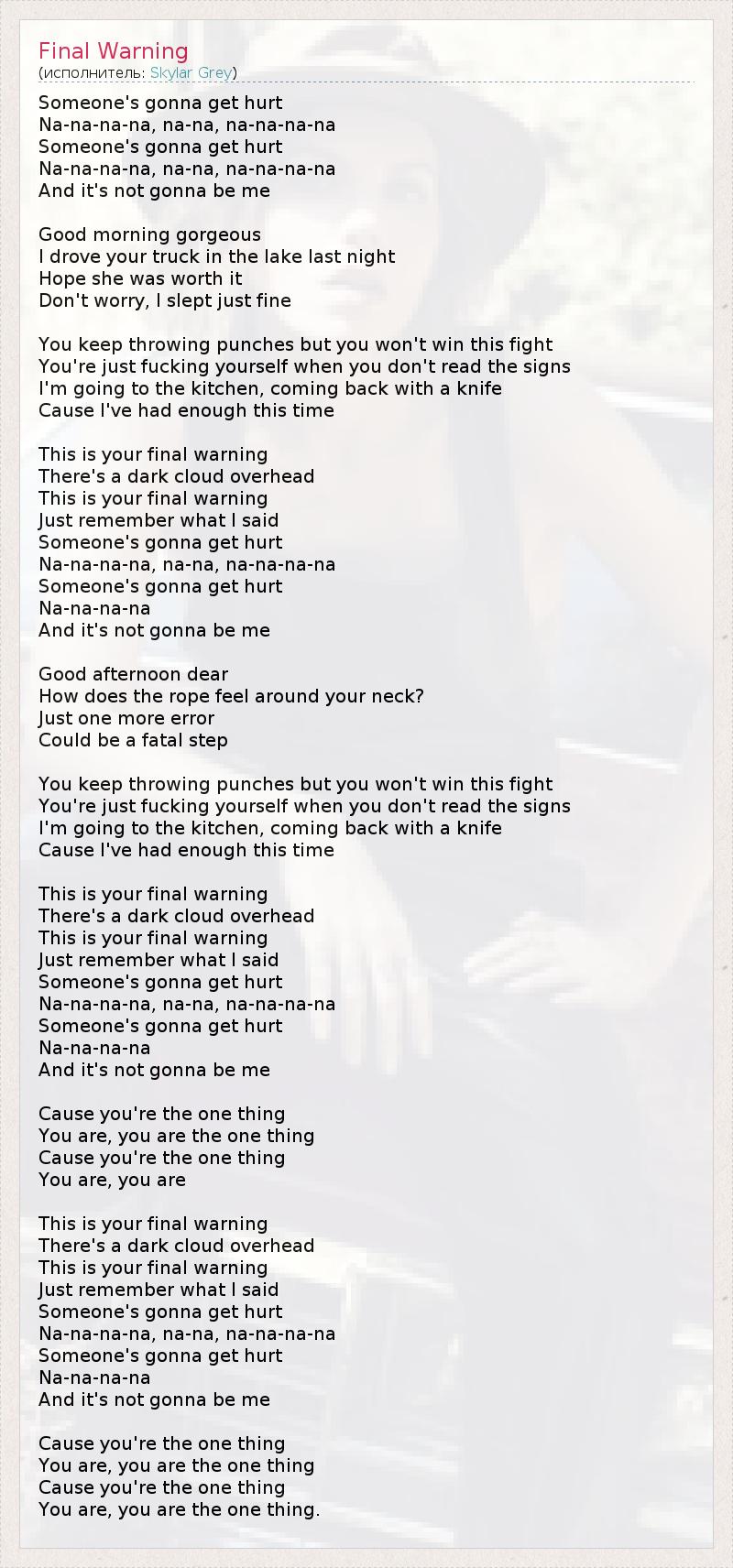 Someone's gonna get hurt Na-na-na-na, na-na, na-na-na-na Someone's gonna get hurt Na-na-na-na, na-na, na-na-na-na And it's not gonna be me Good morning gorgeous I drove your truck in the lake last night Hope she was worth it Don't worry, I slept just fine You keep throwing punches but you won't win this fight You're just fucking yourself when you don't read the signs I'm going to the kitchen, coming back with a knife Cause I've had enough this time This is your final warning There's a dark cloud overhead This is your final warning Just remember what I said Someone's gonna get hurt Na-na-na-na, na-na, na-na-na-na Someone's gonna get hurt Na-na-na-na And it's not gonna be me Good afternoon dear How does the rope feel around your neck? Just one more error Could be a fatal step You keep throwing punches but you won't win this fight You're just fucking yourself when you don't read the signs I'm going to the kitchen, coming back with a knife Cause I've had enough this time This is your final warning There's a dark cloud overhead This is your final warning Just remember what I said Someone's gonna get hurt Na-na-na-na, na-na, na-na-na-na Someone's gonna get hurt Na-na-na-na And it's not gonna be me Cause you're the one thing You are, you are the one thing Cause you're the one thing You are, you are This is your final warning There's a dark cloud overhead This is your final warning Just remember what I said Someone's gonna get hurt Na-na-na-na, na-na, na-na-na-na Someone's gonna get hurt Na-na-na-na And it's not gonna be me Cause you're the one thing You are, you are the one thing Cause you're the one thing You are, you are the one thing.