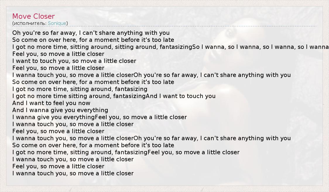 I wanna touch you, so move a little closerOh you're so far away, I can't share anything with you