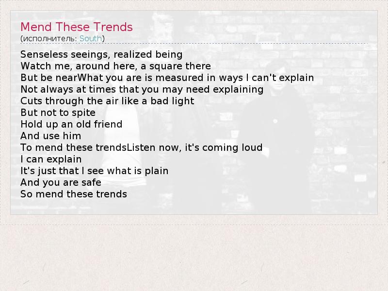 А как ты думаешь, о чем песня "Mend These Trends" ?
