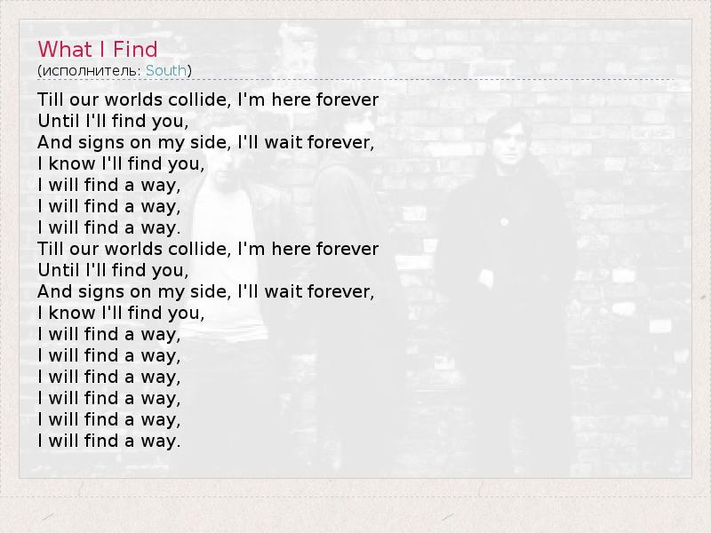Till our worlds collide, I'm here forever Until I'll find you, And signs on my side, I'll wait forever, I know I'll find you, I will find a way, I will find a way, I will find a way. Till our worlds collide, I'm here forever Until I'll find you, And signs on my side, I'll wait forever, I know I'll find you, I will find a way, I will find a way, I will find a way, I will find a way, I will find a way, I will find a way.