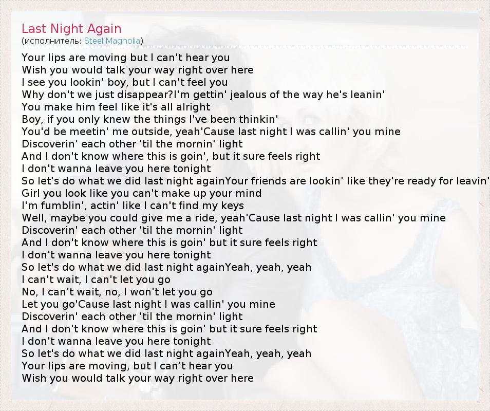 Your lips are moving but I can't hear you Wish you would talk your way right over here I see you lookin' boy, but I can't feel you Why don't we just disappear?I'm gettin' jealous of the way he's leanin' You make him feel like it's all alright Boy, if you only knew the things I've been thinkin' You'd be meetin' me outside, yeah'Cause last night I was callin' you mine Discoverin' each other 'til the mornin' light And I don't know where this is goin', but it sure feels right I don't wanna leave you here tonight So let's do what we did last night againYour friends are lookin' like they're ready for leavin' Girl you look like you can't make up your mind I'm fumblin', actin' like I can't find my keys Well, maybe you could give me a ride, yeah'Cause last night I was callin' you mine Discoverin' each other 'til the mornin' light And I don't know where this is goin' but it sure feels right I don't wanna leave you here tonight So let's do what we did last night againYeah, yeah, yeah I can't wait, I can't let you go No, I can't wait, no, I won't let you go Let you go'Cause last night I was callin' you mine Discoverin' each other 'til the mornin' light And I don't know where this is goin' but it sure feels right I don't wanna leave you here tonight So let's do what we did last night againYeah, yeah, yeah Your lips are moving, but I can't hear you Wish you would talk your way right over here