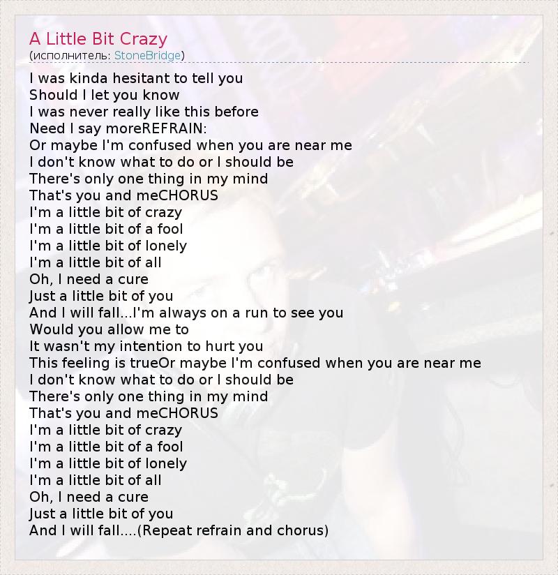 I was kinda hesitant to tell you Should I let you know I was never really like this before Need I say moreREFRAIN: Or maybe I'm confused when you are near me I don't know what to do or I should be There's only one thing in my mind That's you and meCHORUS I'm a little bit of crazy I'm a little bit of a fool I'm a little bit of lonely I'm a little bit of all Oh, I need a cure Just a little bit of you And I will fall...I'm always on a run to see you Would you allow me to It wasn't my intention to hurt you This feeling is trueOr maybe I'm confused when you are near me I don't know what to do or I should be There's only one thing in my mind That's you and meCHORUS I'm a little bit of crazy I'm a little bit of a fool I'm a little bit of lonely I'm a little bit of all Oh, I need a cure Just a little bit of you And I will fall....(Repeat refrain and chorus)