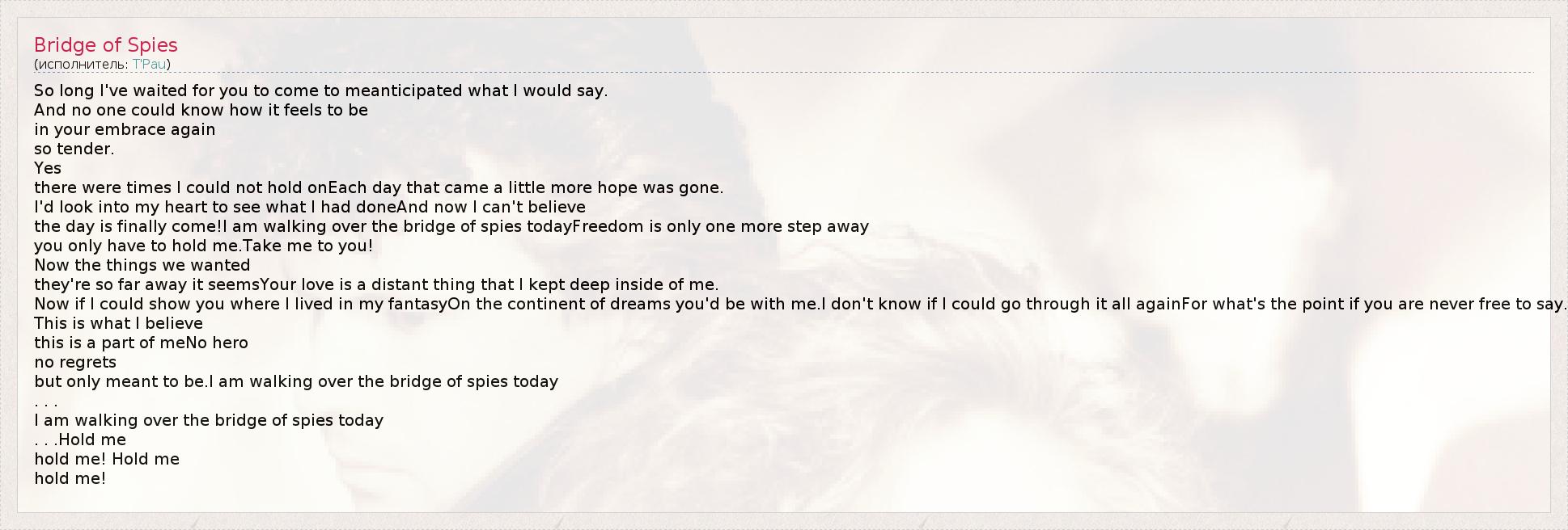 So long I've waited for you to come to meanticipated what I would say. And no one could know how it feels to be in your embrace again so tender. Yes there were times I could not hold onEach day that came a little more hope was gone. I'd look into my heart to see what I had doneAnd now I can't believe the day is finally come!I am walking over the bridge of spies todayFreedom is only one more step away you only have to hold me.Take me to you! Now the things we wanted they're so far away it seemsYour love is a distant thing that I kept deep inside of me. Now if I could show you where I lived in my fantasyOn the continent of dreams you'd be with me.I don't know if I could go through it all againFor what's the point if you are never free to say. This is what I believe this is a part of meNo hero no regrets but only meant to be.I am walking over the bridge of spies today . . . I am walking over the bridge of spies today . . .Hold me hold me! Hold me hold me!