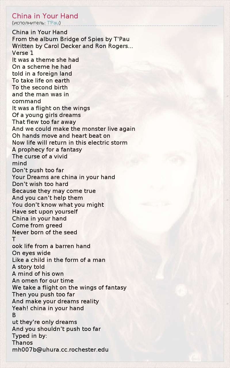 А как ты думаешь, о чем песня "China in Your Hand" ?