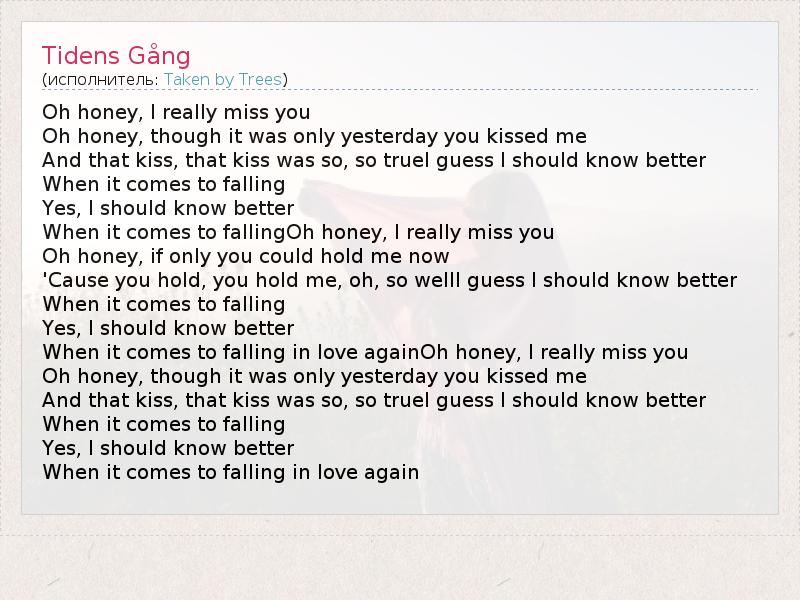 Oh honey, I really miss you Oh honey, though it was only yesterday you kissed me And that kiss, that kiss was so, so trueI guess I should know better When it comes to falling Yes, I should know better When it comes to fallingOh honey, I really miss you Oh honey, if only you could hold me now 'Cause you hold, you hold me, oh, so wellI guess I should know better When it comes to falling Yes, I should know better When it comes to falling in love againOh honey, I really miss you Oh honey, though it was only yesterday you kissed me And that kiss, that kiss was so, so trueI guess I should know better When it comes to falling Yes, I should know better When it comes to falling in love again