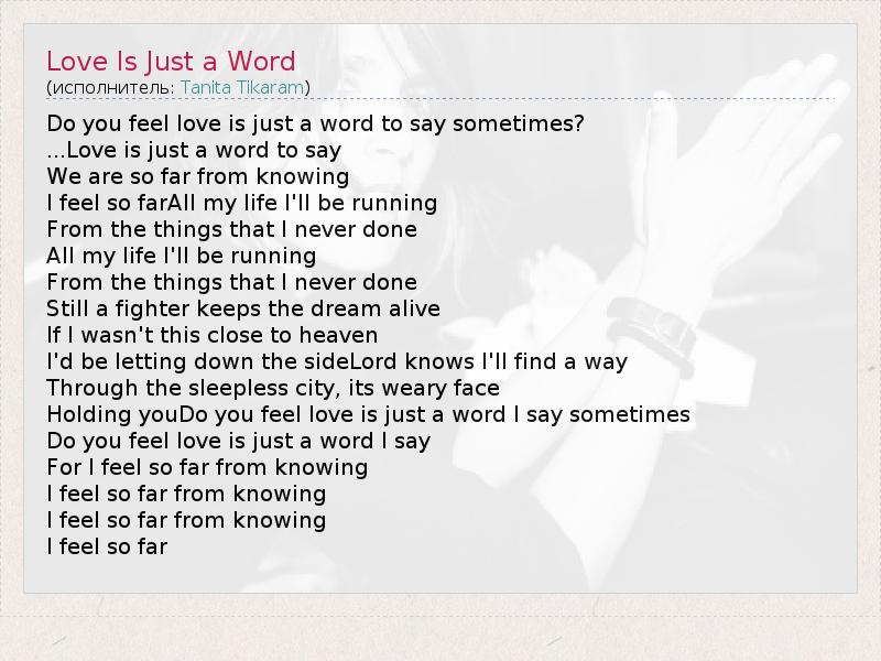 Do you feel love is just a word to say sometimes? ...Love is just a word to say We are so far from knowing I feel so farAll my life I'll be running From the things that I never done All my life I'll be running From the things that I never done Still a fighter keeps the dream alive If I wasn't this close to heaven I'd be letting down the sideLord knows I'll find a way Through the sleepless city, its weary face Holding youDo you feel love is just a word I say sometimes Do you feel love is just a word I say For I feel so far from knowing I feel so far from knowing I feel so far from knowing I feel so far