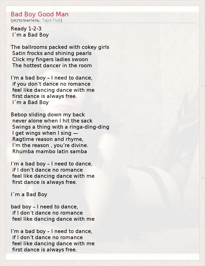 Ready 1-2-3 I´m a Bad Boy The ballrooms packed with cokey girls Satin frocks and shining pearls Click my fingers ladies swoon The hottest dancer in the room I’m a bad boy – I need to dance, if you don’t dance no romance feel like dancing dance with me first dance is always free. I´m a Bad Boy Bebop sliding down my back never alone when I hit the sack Swings a thing with a ringa-ding-ding I get wings when I sing — Ragtime reason and rhyme, I’m the reason , you’re divine. Rhumba mambo latin samba I’m a bad boy – I need to dance, if I don’t dance no romance feel like dancing dance with me first dance is always free. I´m a Bad Boy bad boy – I need to dance, if I don’t dance no romance feel like dancing dance with me I’m a bad boy – I need to dance, if I don’t dance no romance feel like dancing dance with me first dance is always free.