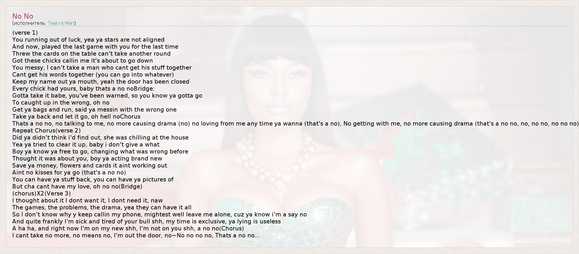 Thats a no no, no talking to me, no more causing drama (no) no loving from me any time ya wanna (that's a no), No getting with me, no more causing drama (that's a no no, no, no no, no no no)