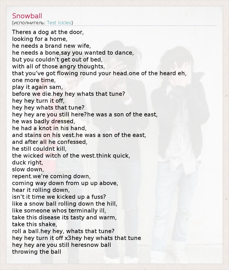 Theres a dog at the door, looking for a home, he needs a brand new wife, he needs a bone,say you wanted to dance, but you couldn't get out of bed, with all of those angry thoughts, that you've got flowing round your head.one of the heard eh, one more time, play it again sam, before we die.hey hey whats that tune? hey hey turn it off, hey hey whats that tune? hey hey are you still here?he was a son of the east, he was badly dressed, he had a knot in his hand, and stains on his vest.he was a son of the east, and after all he confessed, he still couldnt kill, the wicked witch of the west.think quick, duck right, slow down, repent.we're coming down, coming way down from up up above, hear it rolling down, isn't it time we kicked up a fuss? like a snow ball rolling down the hill, like someone whos terminally ill, take this disease its tasty and warm, take this shake, roll a ball.hey hey, whats that tune? hey hey turn it off x3hey hey whats that tune hey hey are you still heresnow ball throwing the ball
