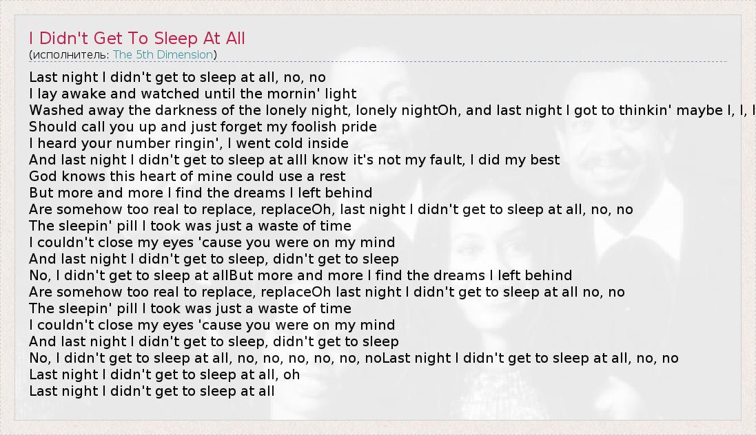 ГлавнаяИсполнителиThe 5th DimensionI Didn't Get To Sleep At All