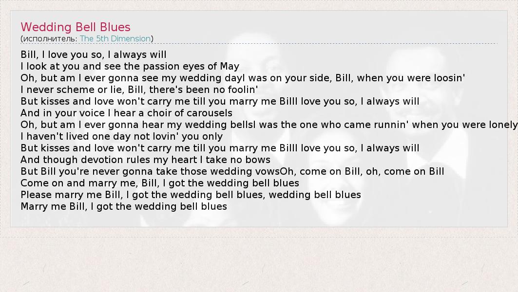 А как ты думаешь, о чем песня "Wedding Bell Blues" ?