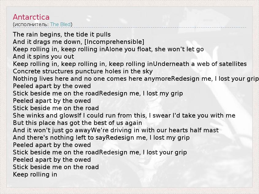 The rain begins, the tide it pulls And it drags me down, [Incomprehensible] Keep rolling in, keep rolling inAlone you float, she won't let go And it spins you out Keep rolling in, keep rolling in, keep rolling inUnderneath a web of satellites Concrete structures puncture holes in the sky Nothing lives here and no one comes here anymoreRedesign me, I lost your grip Peeled apart by the owed Stick beside me on the roadRedesign me, I lost my grip Peeled apart by the owed Stick beside me on the road She winks and glowsIf I could run from this, I swear I'd take you with me But this place has got the best of us again And it won't just go awayWe're driving in with our hearts half mast And there's nothing left to sayRedesign me, I lost my grip Peeled apart by the owed Stick beside me on the roadRedesign me, I lost your grip Peeled apart by the owed Stick beside me on the road Keep rolling in