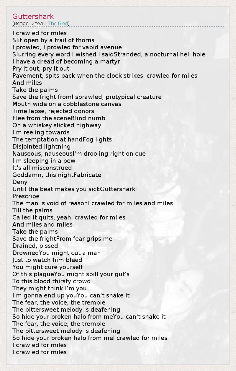 I crawled for miles Slit open by a trail of thorns I prowled, I prowled for vapid avenue Slurring every word I wished I saidStranded, a nocturnal hell hole I have a dread of becoming a martyr Pry it out, pry it out Pavement, spits back when the clock strikesI crawled for miles And miles Take the palms Save the fright fromI sprawled, protypical creature Mouth wide on a cobblestone canvas Time lapse, rejected donors Flee from the sceneBlind numb On a whiskey slicked highway I'm reeling towards The temptation at handFog lights Disjointed lightning Nauseous, nauseousI'm drooling right on cue I'm sleeping in a pew It's all misconstrued Goddamn, this nightFabricate Deny Until the beat makes you sickGuttershark Prescribe The man is void of reasonI crawled for miles and miles Till the palms Called it quits, yeahI crawled for miles And miles and miles Take the palms Save the frightFrom fear grips me Drained, pissed DrownedYou might cut a man Just to watch him bleed You might cure yourself Of this plagueYou might spill your gut's To this blood thirsty crowd They might think I'm you I'm gonna end up youYou can't shake it The fear, the voice, the tremble The bittersweet melody is deafening So hide your broken halo from meYou can't shake it The fear, the voice, the tremble The bittersweet melody is deafening So hide your broken halo from meI crawled for miles I crawled for miles I crawled for miles