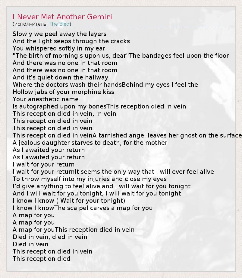 А как ты думаешь, о чем песня "I Never Met Another Gemini" ?