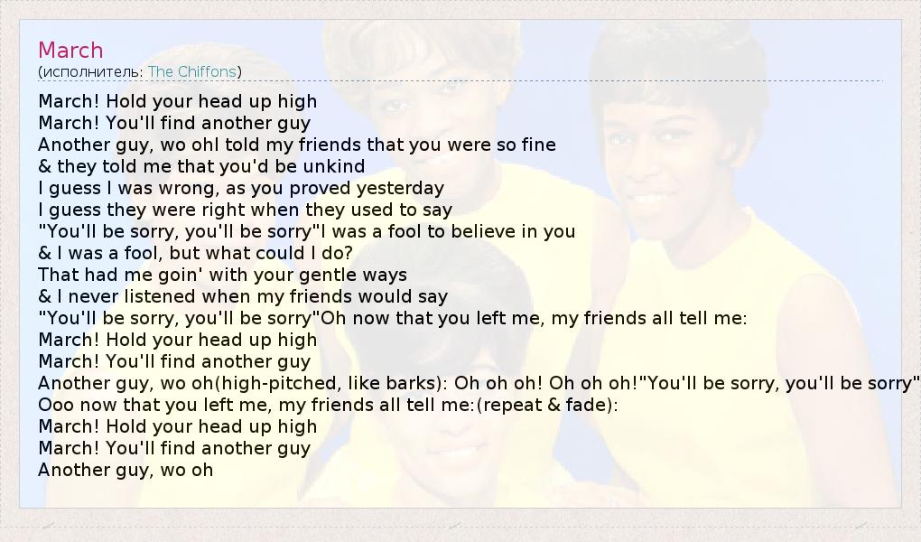 March! Hold your head up high March! You'll find another guy Another guy, wo ohI told my friends that you were so fine & they told me that you'd be unkind I guess I was wrong, as you proved yesterday I guess they were right when they used to say "You'll be sorry, you'll be sorry"I was a fool to believe in you & I was a fool, but what could I do? That had me goin' with your gentle ways & I never listened when my friends would say "You'll be sorry, you'll be sorry"Oh now that you left me, my friends all tell me: March! Hold your head up high March! You'll find another guy Another guy, wo oh(high-pitched, like barks): Oh oh oh! Oh oh oh!"You'll be sorry, you'll be sorry" Ooo now that you left me, my friends all tell me:(repeat & fade): March! Hold your head up high March! You'll find another guy Another guy, wo oh