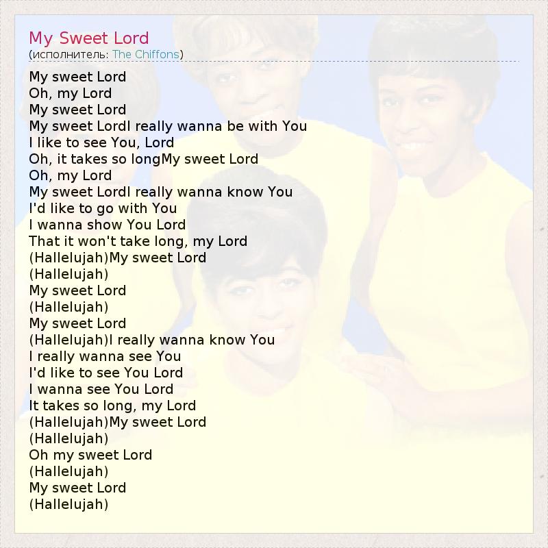My sweet Lord Oh, my Lord My sweet Lord My sweet LordI really wanna be with You I like to see You, Lord Oh, it takes so longMy sweet Lord Oh, my Lord My sweet LordI really wanna know You I'd like to go with You I wanna show You Lord That it won't take long, my Lord (Hallelujah)My sweet Lord (Hallelujah) My sweet Lord (Hallelujah) My sweet Lord (Hallelujah)I really wanna know You I really wanna see You I'd like to see You Lord I wanna see You Lord It takes so long, my Lord (Hallelujah)My sweet Lord (Hallelujah) Oh my sweet Lord (Hallelujah) My sweet Lord (Hallelujah)