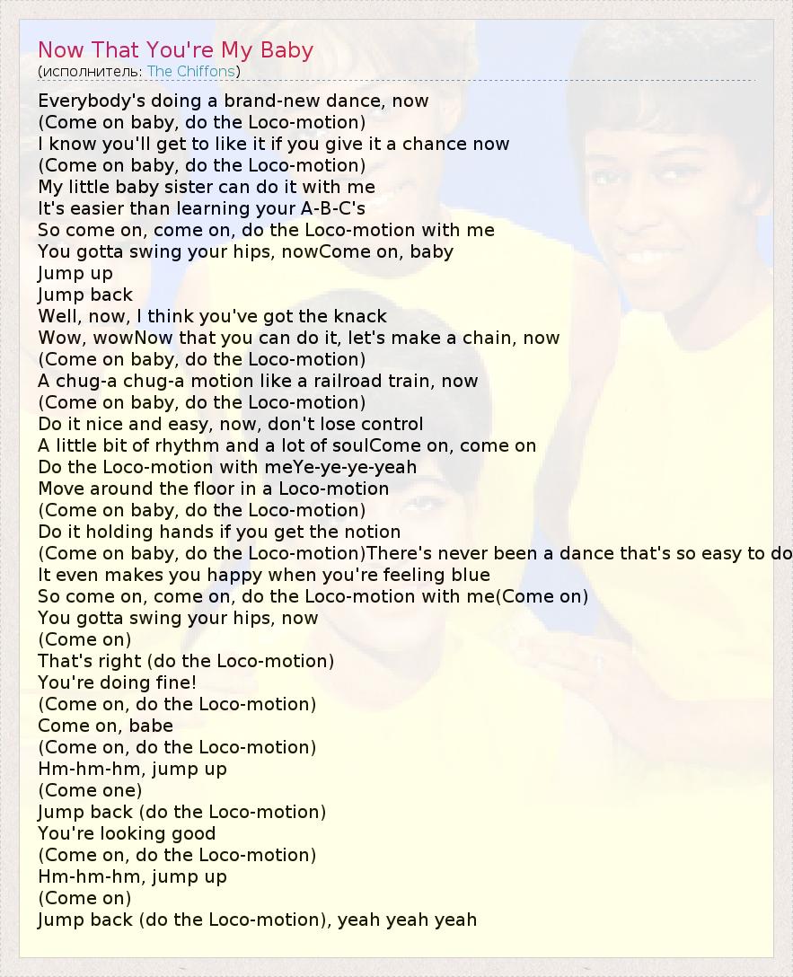 Everybody's doing a brand-new dance, now (Come on baby, do the Loco-motion) I know you'll get to like it if you give it a chance now (Come on baby, do the Loco-motion) My little baby sister can do it with me It's easier than learning your A-B-C's So come on, come on, do the Loco-motion with me You gotta swing your hips, nowCome on, baby Jump up Jump back Well, now, I think you've got the knack Wow, wowNow that you can do it, let's make a chain, now (Come on baby, do the Loco-motion) A chug-a chug-a motion like a railroad train, now (Come on baby, do the Loco-motion) Do it nice and easy, now, don't lose control A little bit of rhythm and a lot of soulCome on, come on Do the Loco-motion with meYe-ye-ye-yeah Move around the floor in a Loco-motion (Come on baby, do the Loco-motion) Do it holding hands if you get the notion (Come on baby, do the Loco-motion)There's never been a dance that's so easy to do It even makes you happy when you're feeling blue So come on, come on, do the Loco-motion with me(Come on) You gotta swing your hips, now (Come on) That's right (do the Loco-motion) You're doing fine! (Come on, do the Loco-motion) Come on, babe (Come on, do the Loco-motion) Hm-hm-hm, jump up (Come one) Jump back (do the Loco-motion) You're looking good (Come on, do the Loco-motion) Hm-hm-hm, jump up (Come on) Jump back (do the Loco-motion), yeah yeah yeah